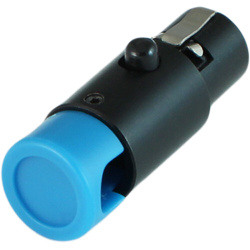 The Cable Techniques LPS-5FL is an LPS Series, low-profile right-angle TA5F mini-XLR female connector with a large blue cap designed for cable diameters up to about 5mm OD. The outlet can be set to either right or left of the release pin (from 3 to 9 o'clock) with a 60° adjustment swing to fine-tune the angle.
