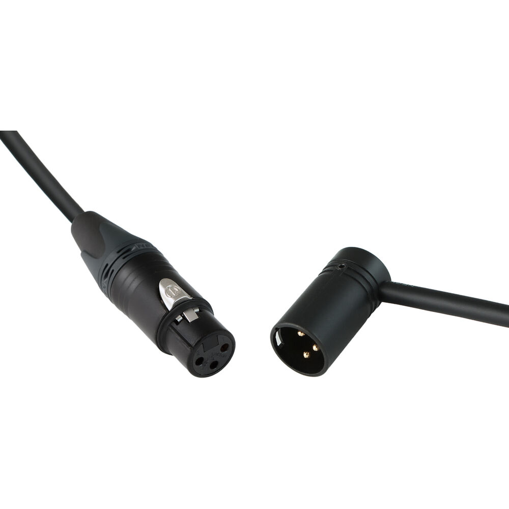 The 10' cable is terminated with a straight XLR-3 female Neutrik XX Series connector (with a black ring) at one end and a low-profile, right-angle XLR-3 male connector (with a black cap) at the other. You can adjust the low-profile XLR cable outlet orientation to fine-tune it to your exact needs with a 120° swing.