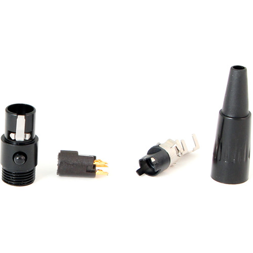 The black Cable Techniques TA4F 4-Pin Female Mini-XLR Connector is a TA4F connector designed to be attached to an interconnect cable for use with wireless microphones and power modules in ENG, field recording, and television production. It features a 4-pin female mini-XLR end with gold contacts and a standard cable outlet.