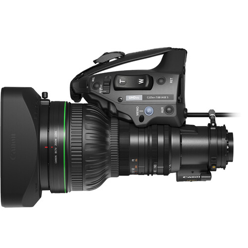 Capture UHD 4K footage with the 2/3" UHD XS 25x Standard 7.6-190mm Full-Servo Lens from Canon. The CJ25EX7.6B IASE S is a 25x zoom lens for 2/3" format 3-chip ENG/EFP cameras. It retains the compact, lightweight design of Canon's legacy servo lenses while weighing only 4.4 lb and improving on the zoom range and the digital drive, as well as supporting UHD 4K and HDR footage. The lens incorporates a B4 mount, standard for ENG/EFP lenses, and it features a built-in 2x extender.