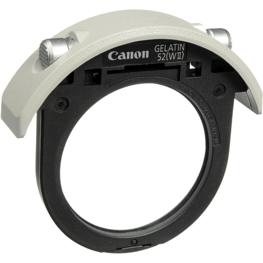 The black 52mm Drop-in Gelatin Filter Holder from Canon is a convenient way to add filtration to your shots. This 52mm rear mounted holder contains accepts user-supplied cut gelatin filters. The filters are held in place via a pressure clip held firmly against the holder's frame. Up to three gel filters can be used within the holder.
