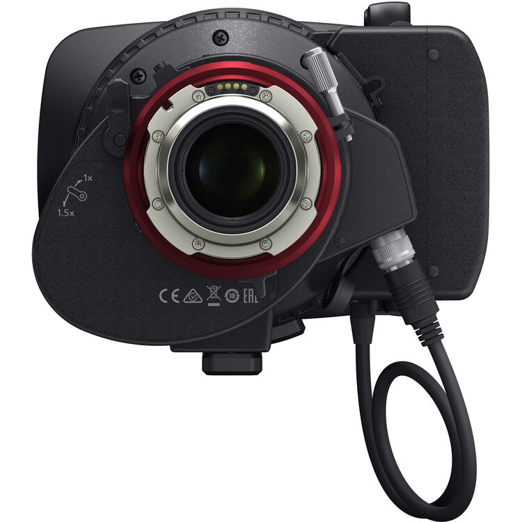 The lens features the same 12-pin camera interface for power and serial data as found on regular Canon broadcast lenses