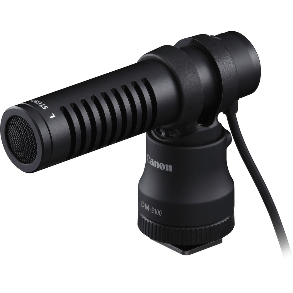 Designed to improve audio quality while recording video, the Canon DM-E100 Directional Microphone is a shoe-mounted, wired external mic with a 3.5mm plug. The directional design is suitable for a variety of recording applications and a windscreen is included to reduce wind noise when working in noisier and outdoor environments.