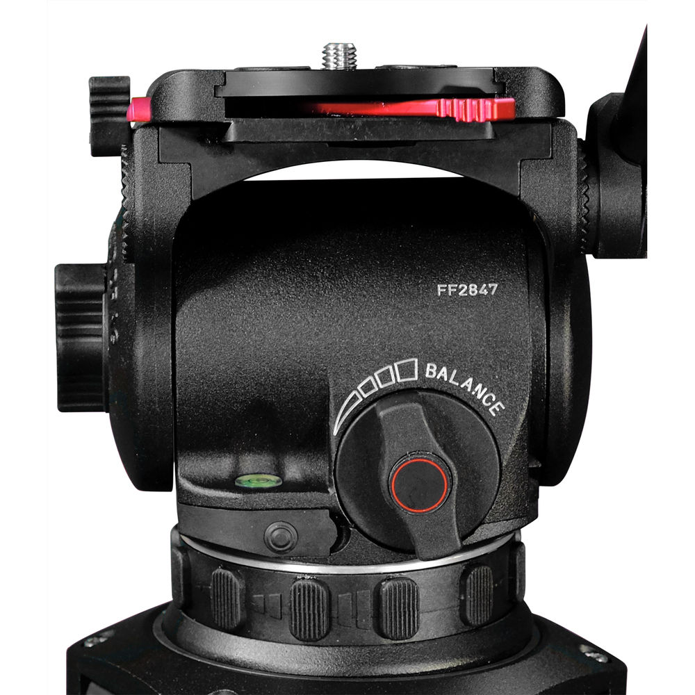 The Fluid 12 head offers a ±90° tilt range with smooth, continuous counterbalance, a European quick release camera plate, a large pan drag ring, and an illuminated bubble level. The Focus 12 Red Lock System includes a set of hooking rubber tripod feet and a soft carry bag.