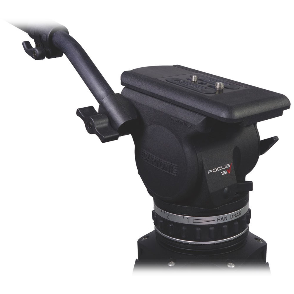 The Cartoni Focus 18 Fluid Head features a 100mm ball base and supports loads between 13.2 to 40 lb, with perfect balance along its entire +/-90° tilt range.