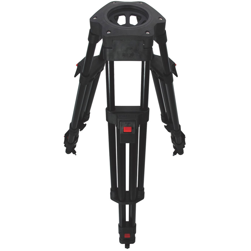 This is the Cartoni H604 Heavy Duty Tripod, made of carbon fiber and featuring a 100mm bowl-base, 2 leg stages, 176 lb payload, and quick and secure flip-clamping system with safety locks. The feet feature threaded spikes that support optional adjustable rubber feet as well as dollies and ground spreaders. The H604 also supports a mid-level spreader, but it would require optional pivoting tripod feet when incorporating one.