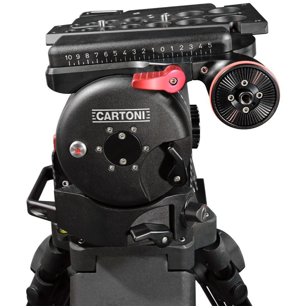 The fluid head comes equipped with the standard dovetail plate that mounts on a large sliding platform, which features a crank for making precise adjustments. The platform is indexed for repeatable balance adjustment.