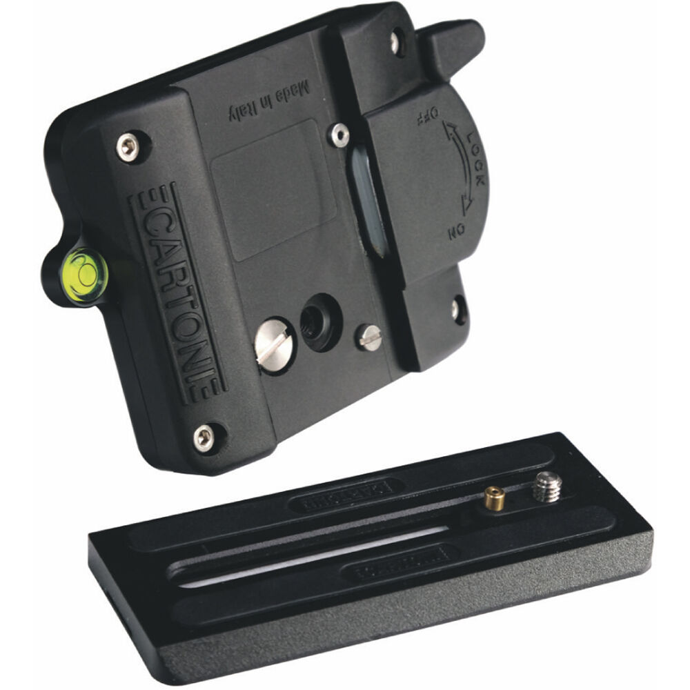 The lightweight hard-plastic base has a simple but solid design that features 1/4"-20 and 3/8"-16 mounting threads compatible with Cartoni mounts such as the T650 monopod, the KPTZ001 light PTZ stand, or the KT271 PTZ lightweight tripod. The base features a bubble level to ensure your camera is properly aligned. The camera plate features 1/4"-20 and 3/8"-16 camera mounting screws, and a safety pin on the plate ensures your camera doesn't twist while mounted.