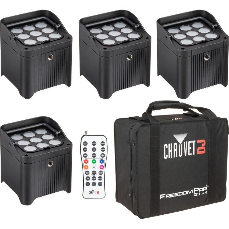Lighting designers and event coordinators in search of a wireless, battery-operated PAR kit should look no further than the Chauvet DJ Freedom Par Q9 X4, a 4-pack of bright, powerful, and 100% wireless fixtures well suited for special events, weddings, performance halls, and more. Each of the fixture's nine quad colored LEDs (red, green, blue, amber) are rated for 50,000 hours and will provide years of reliable service. An adjustable kickstand enables you to shine light directly where it is needed, while the built-in glare shield prevents light spillage. A magnetic diffuser attaches to widens the coverage area.