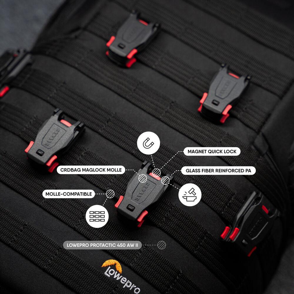 This black Maglock Buckle from CRDBAG is a sturdy attachment solution for MOLLE and PALS systems on your bags, cases, and more. The fiberglass-reinforced nylon construction is durable and strong, and it supports max loads up to 22 lb. Use the lock to attach gear, pouches, and more quickly, easily, and securely. The magnetic locking mechanism is specially designed to secure your equipment, and it will also open under extreme stress to prevent damage to your gear or the buckle. It offers fast and easy adjustments to your setup when necessary, so you can find the perfect configuration to meet your needs.