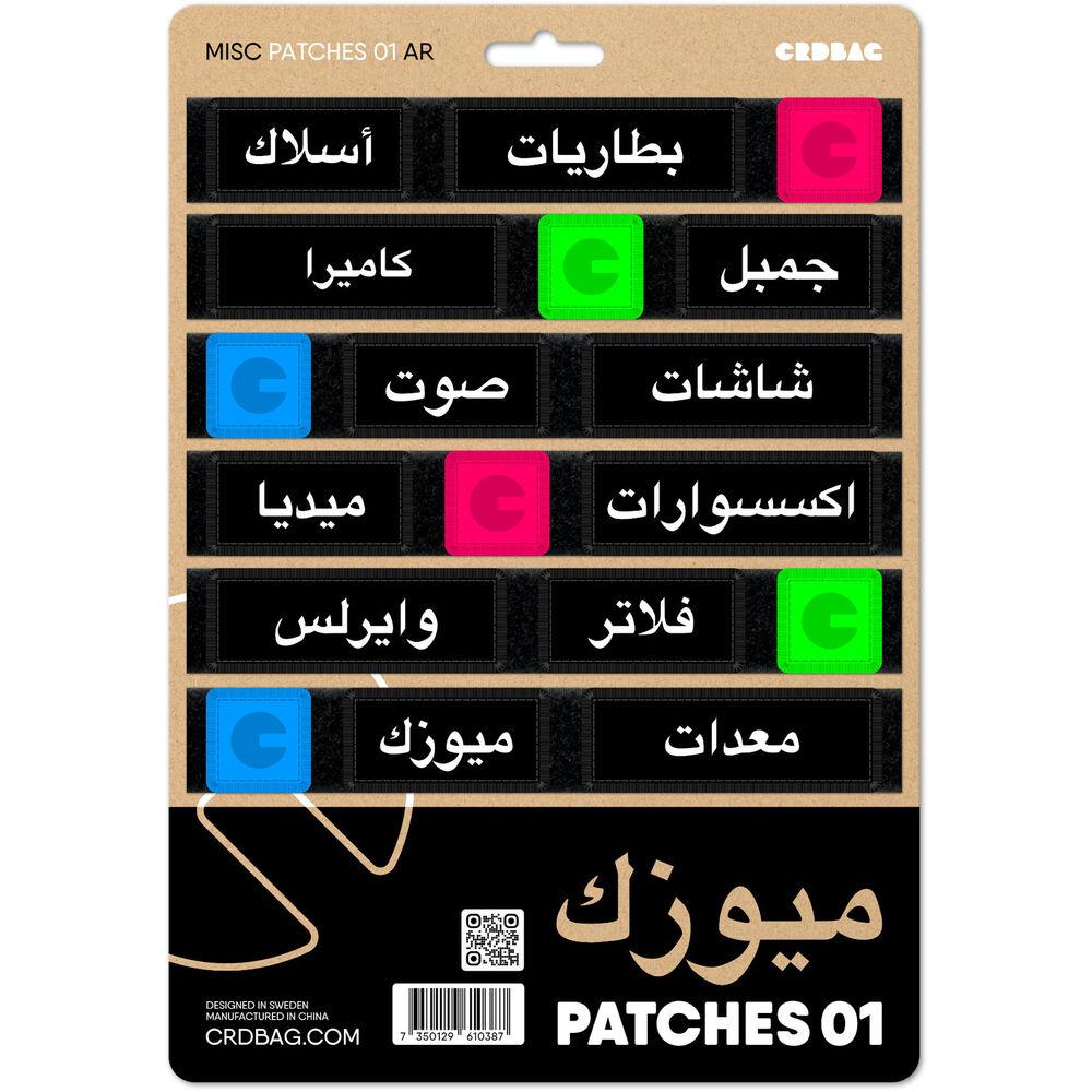 This set of 18 miscellaneous Arabic 01 Embroidery Patches from CRDBAG includes 12 embroidered text patches and six colored patches. They feature professional, high-quality embroidery and secure hook-and-loop attachment for easily identifying and organizing your equipment. These patches are used for color-coding and labeling your gear to enhance workflow, save time, and ensure an efficient, organized setup. The labels include: Cables, Camera, Media, Wireless, and more.