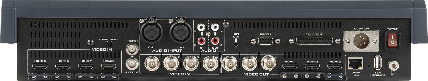 Video Output | 3 x SDI 3 x HDMI assignable: Multiview, PGM, PVW, PGM+DSK, Clean PGM, Clean PVW, Input 1-8, STILL 1, STILL 2, Flex source |