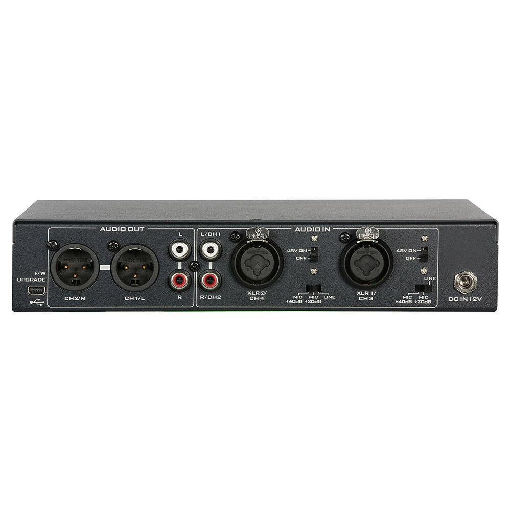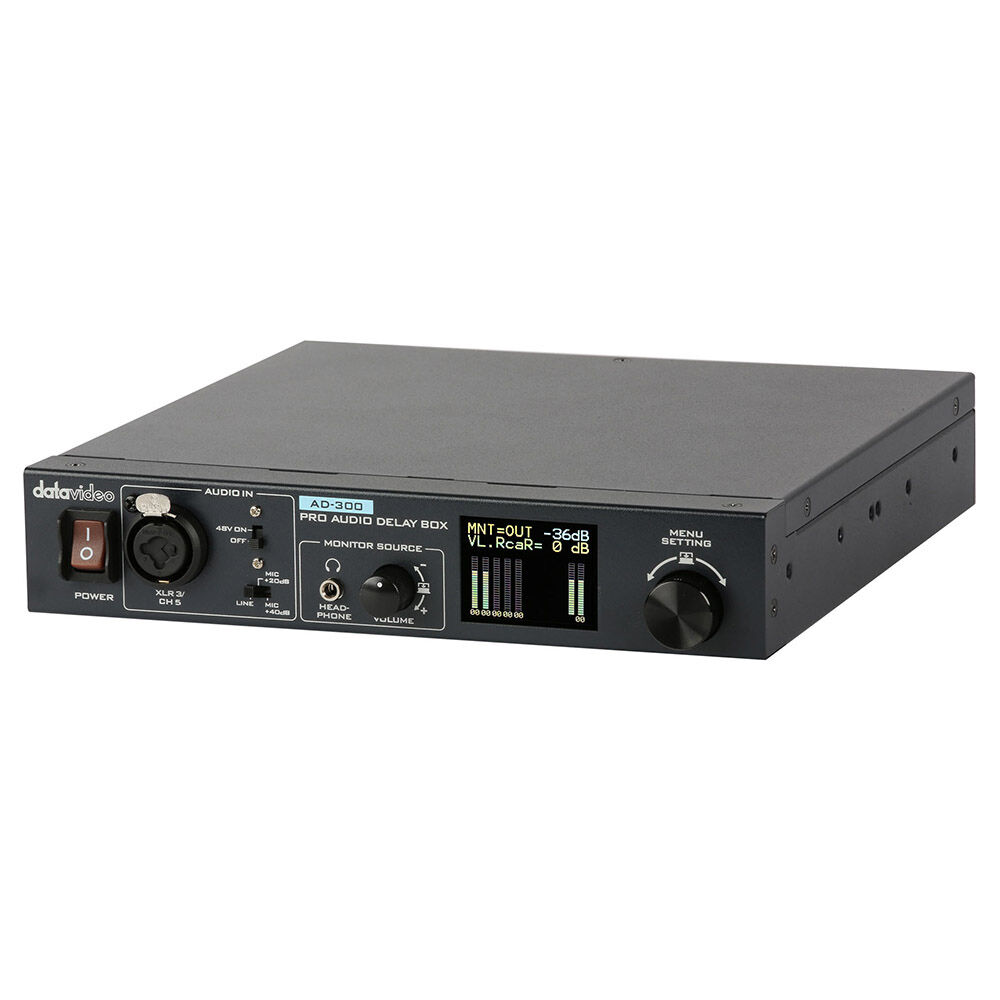 Get multiple audio sources in sync with your video, using the AD-300 Pro Audio Delay Box from Datavideo. This multifunction sound box offers 5 x input channels: a pair of RCAs, a pair of XLR-1/4" combo inputs, and an additional XLR-1/4" input on the front panel. The combo inputs feature mic- and line-level switches along with phantom power switches to provide +48V phantom power for condenser microphones. The unit offers a built-in mixer to route the incoming signals to a pair of stereo outputs with both balanced XLR and RCA connections to choose from. The 3.5mm front-panel headphone jack provides quick monitoring.