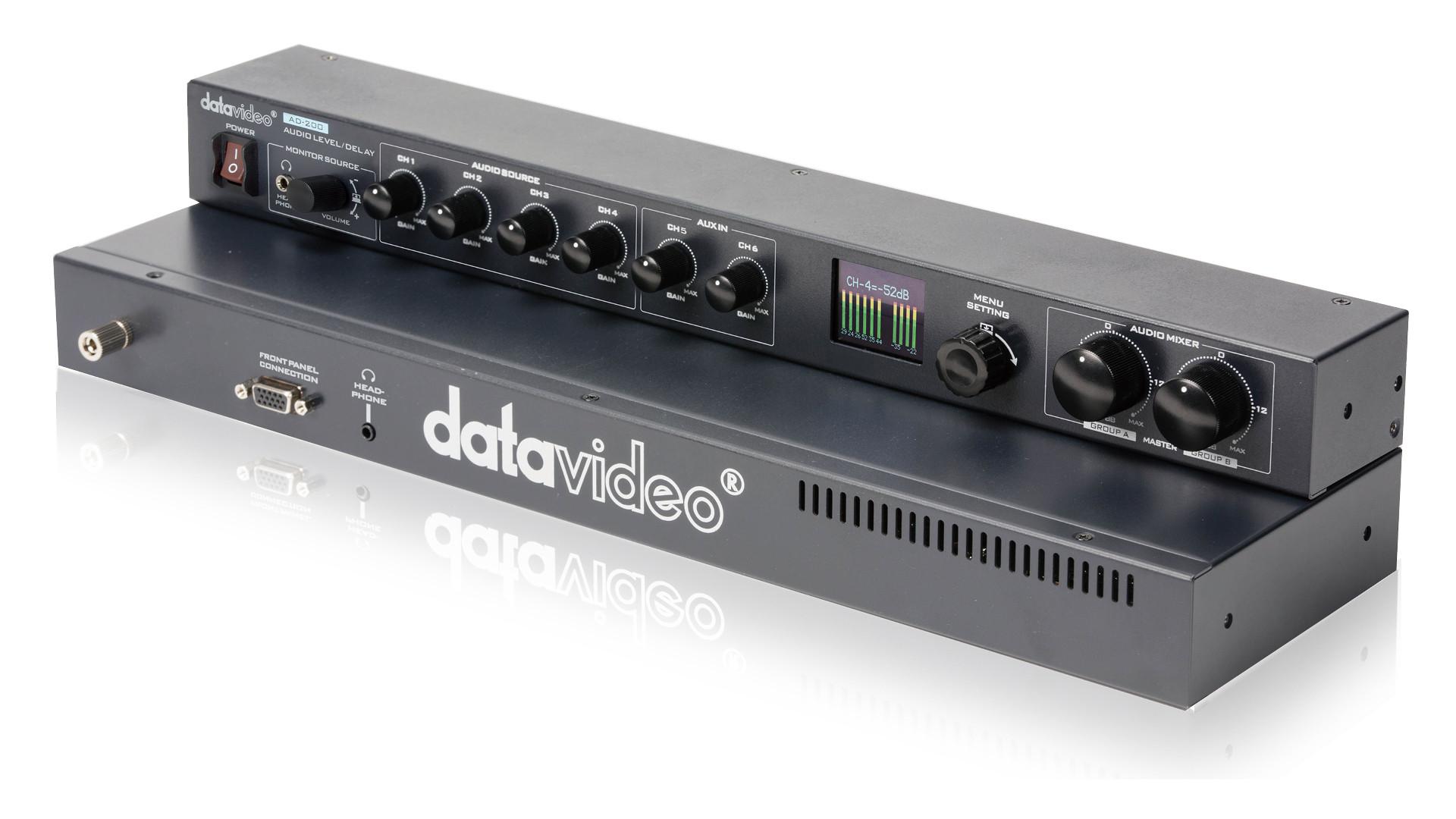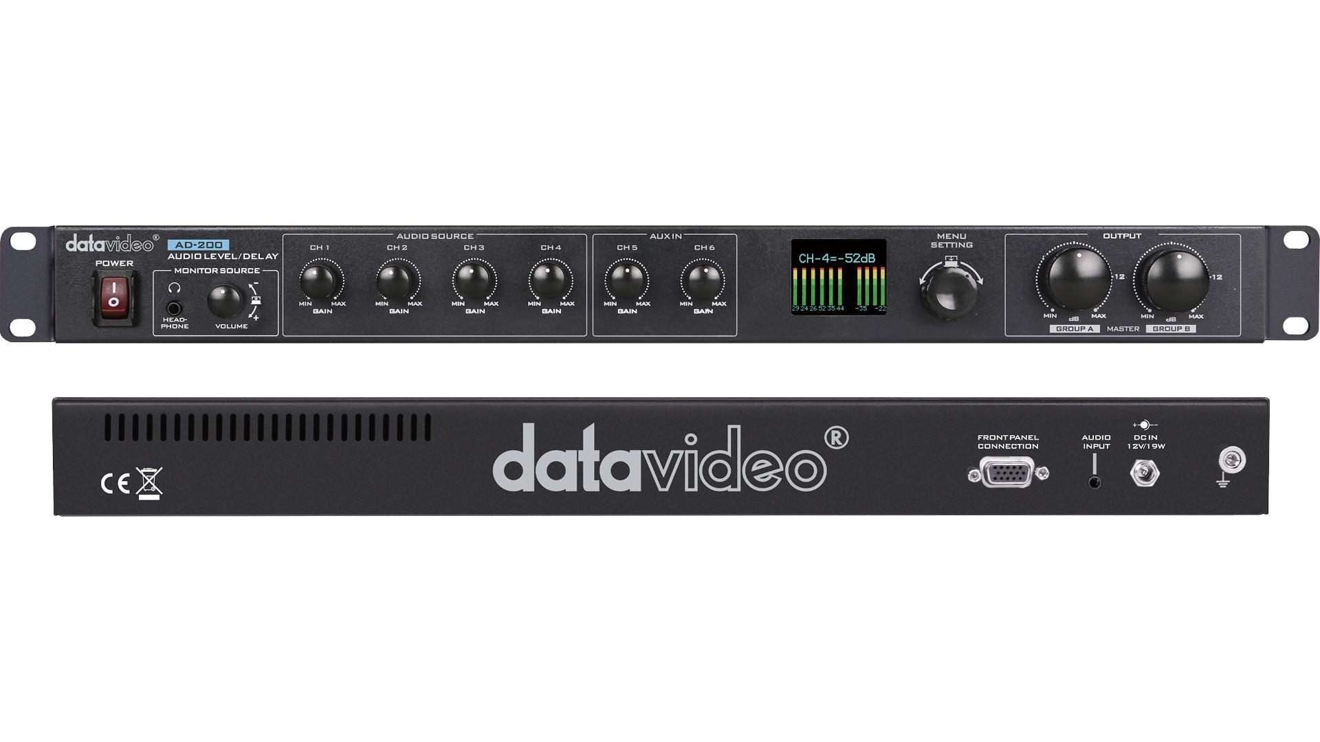 The 1RU AD-200 6 Channel Audio Delay/Mixer with Level Adjustment from Datavideo is an integration of 6 channel audio delay with a matrix mapping function of 4 channel outputs audio mixer. The AD-200 is comprised of two separate parts: the main unit and the control unit. The two parts are 1RU each and can be easily installed on an OB Van or customized rack.