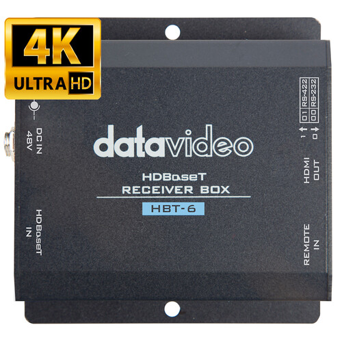 RS-232 and RS-422 serial connections allow you to control the receiver easily. Power can be delivered to the receiver via PoE or using the included AC cord and DC 48V power adapter. The HBT-6 is compatible with Datavideo's separately available HBT-5 HDBaseT transmitter and PTC-140T PTZ camera.
