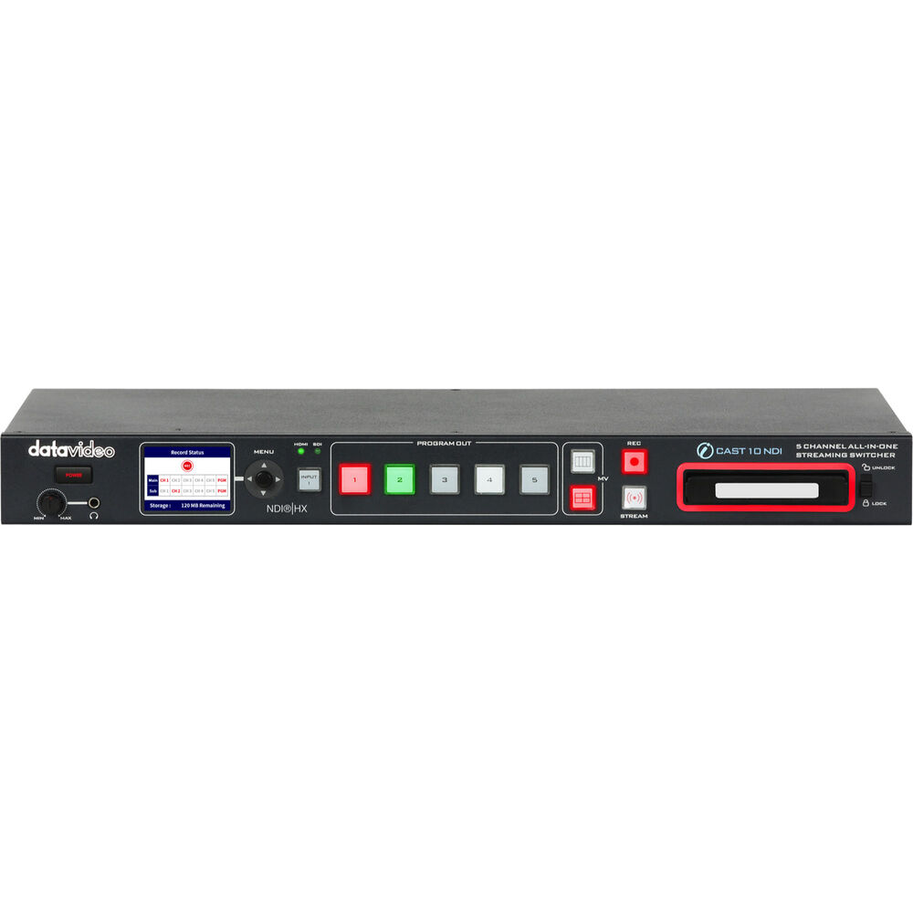 Featuring an integrated switcher, camera controller, and streaming encoder, the Datavideo iCast 10NDI 5-Channel 1080p All-in-One Streaming Switcher is ideal for use for events, houses of worship, and educational use. Supporting up to five inputs, you can input different video sources, such as a PTZ or document camera, and even from your laptop using UVC via USB. Switch your program live using the front panel buttons, integrated touchscreen, or control over LAN.