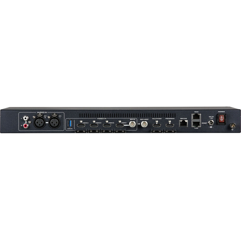 The switcher can encode your program output live for streaming, and you can also record the live program output to an optional SD card, as well as the five individual inputs for later post work and program output to an optional 2.5" HDD or SDD that you put in the included drive enclosure. Two HDMI outputs, one program and one multiview, allow you to view your program locally while you stream and/or record.