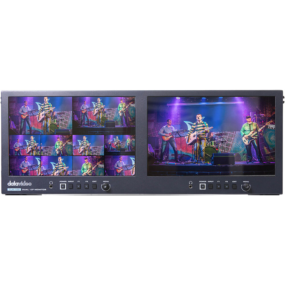 The 10" Dual IPS LCD Monitor from Datavideo is a rack-mounted monitoring unit designed for broadcast, video production, and A/V users. The monitors feature built-in vectorscope, waveform, and video signal converters. Each has one 3G/HD/SD-SDI input and one HDMI input, with loop-through output for both. Built-in signal cross conversion allows each monitor to use one input for display and the other for conversion. The 4 RU rackmount design offers a mounting solution for on-site monitoring, video walls, and production trucks.