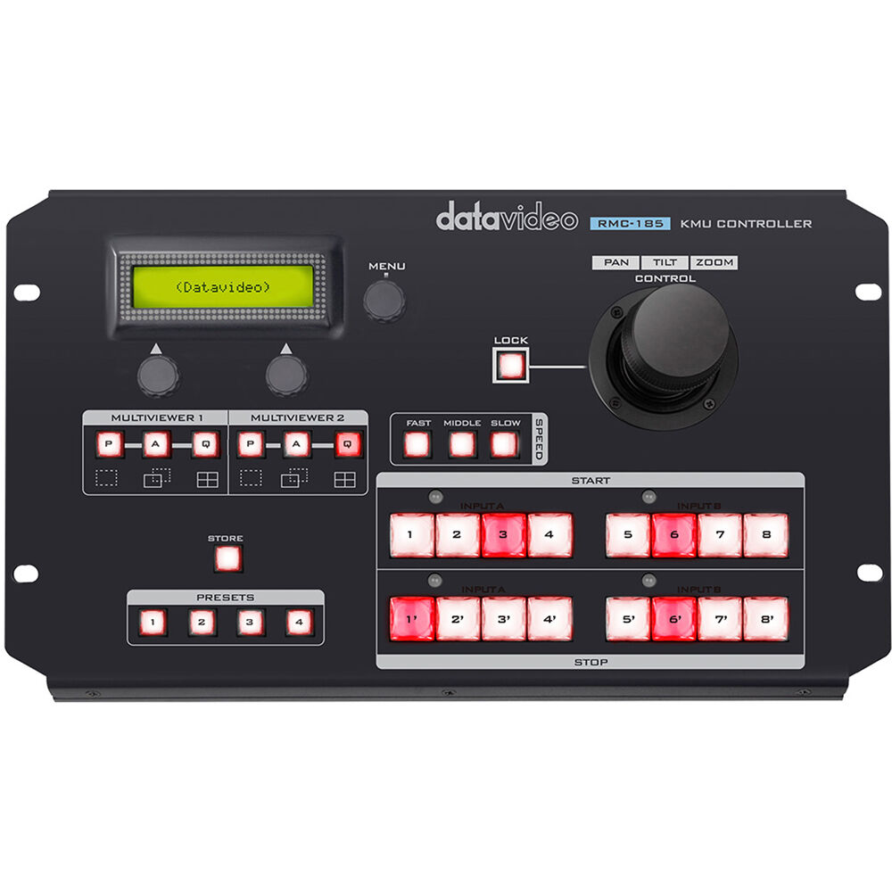 The RMC-185 KMU Controller from Datavideo is a physical controller designed specifically for control of the KMU series 4K multi-camera processor. The RMC-185 interfaces with the KMU-100 via an RS-422 interface. This dedicated controller allows operators to make smooth zoom and pan/tilt motions by using the joystick. The four presets hold scale, position, motion path, and speed of all four individual 3 Gb/s outputs per channel. The buttons allow start/stop/reset of motion in a predefined speed for every individual output.