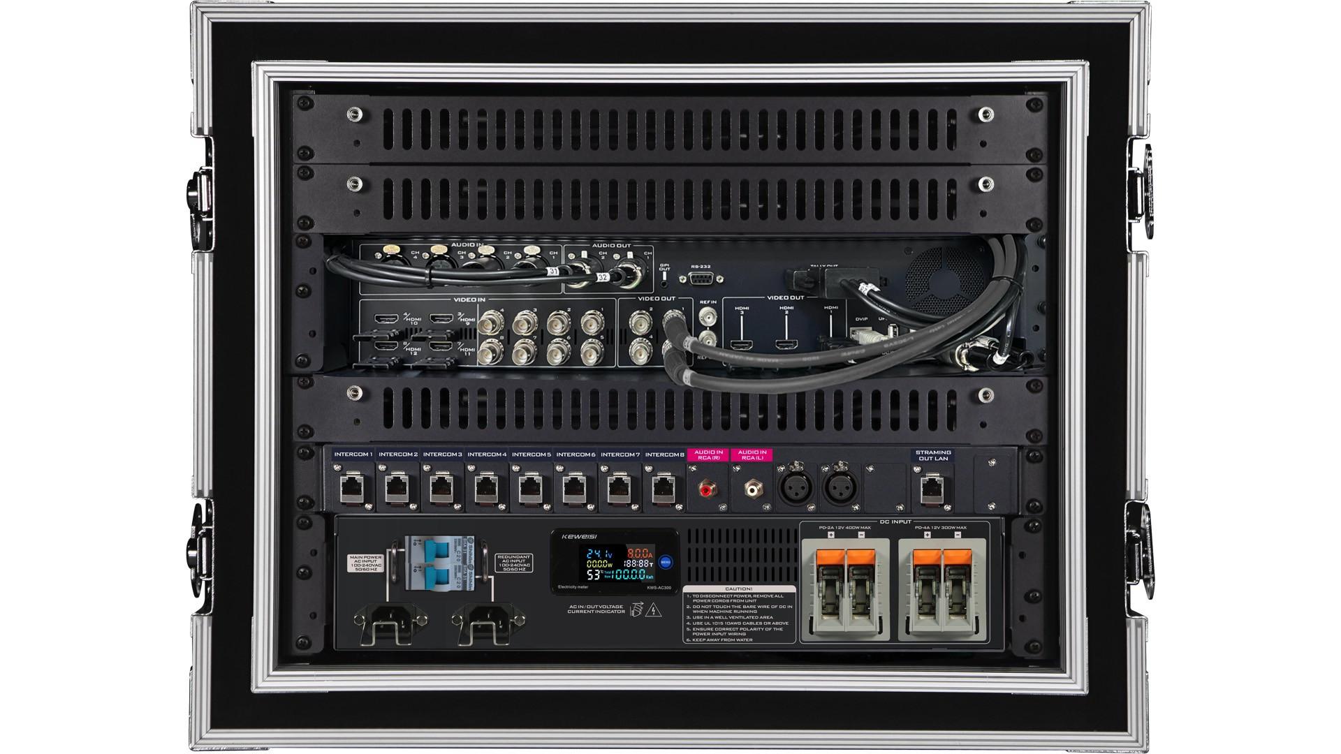 he MS-4000 is a 4K 8-channel mobile production studio designed for the multimedia era, presented in a compact and portable flight case form. It offers a comprehensive video production solution, including video switching, communication, recording, waveform vector monitoring, screen integration, and more.