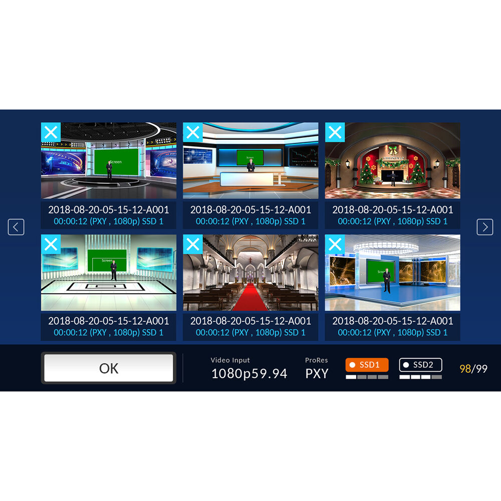 The record function supports ProRes 422, Proxy, LT, and HQ sampling formats in QuickTime MOV file format, recorded to the internal 2.5" SSD formatted in exFAT drive format. The audio is recorded in up to 24-bit uncompressed PCM format with a sample rate of 48 kHz. Additional features include genlock and timecode input and output, as well as remote control via DVIP over a LAN and RS-232/422 serial communication.