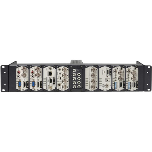 The RMK-2 Rackmount with Power Supply from Datavideo is designed to hold up to eight DAC converters in any combination. It includes a single power supply for all eight converters and occupies a 2 RU space.
