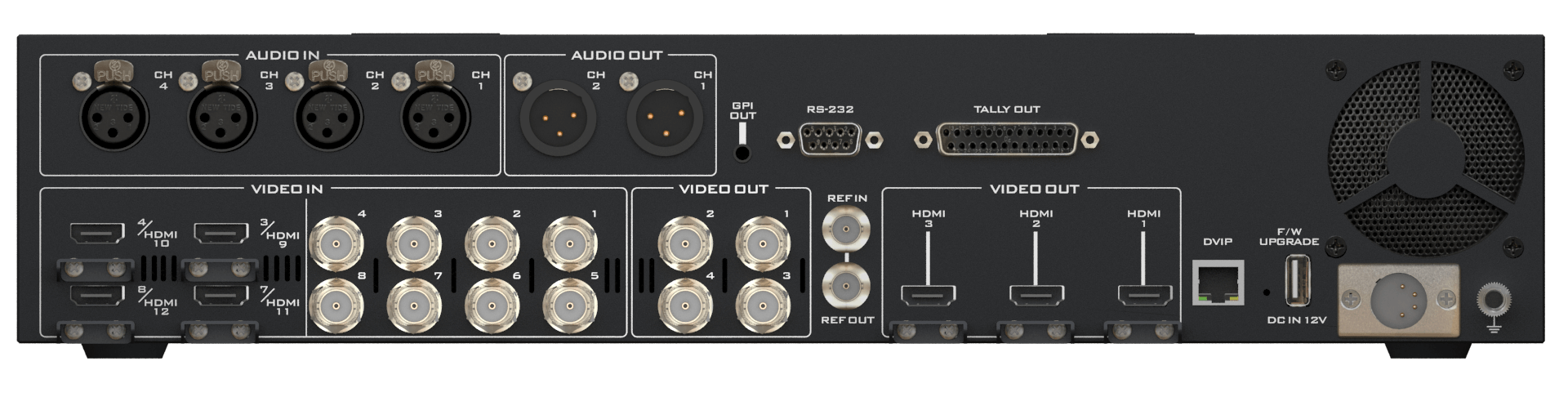 Video Output | 4 x 12G-SDI 3 x HDMI All assignable: Multiview, PGM, PVW, PGM+DSK, Clean PGM, Clean PVW, Input 1-12 |