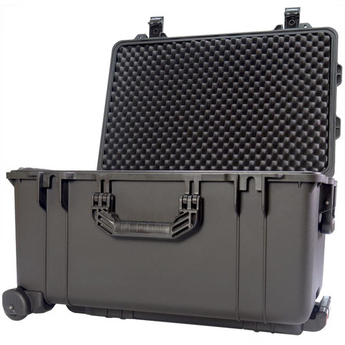 This case's interior includes one foam piece in the lid and three foam fittings in the main compartment. Wheel the case along using the retractable handle or grasp it using the large, hinged top handle.