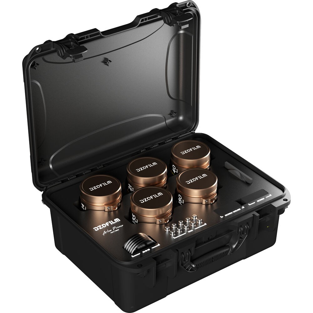 Use the Arles Lustre T1.6 FF/VV Cinema Prime 5-Lens Kit from DZOFilm to create warm, nostalgic full-frame looks in wider and tighter focal lengths that complement the base 4-lens set. These 14, 21, 40, 135, and 180 lenses feature amber halo effects, retro-style metallic bodies, and fast T1.6/2.2/2.8 maximum apertures.