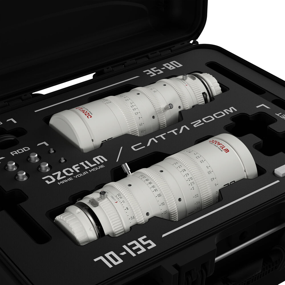 The bundle includes the Catta 35 to 80mm cinema lens, the Catta 70 to 135mm cinema lens, and a hard-shell case. Both lenses come with an E-mount that can be interchanged with optional RF, L, X, or Z mounts, and each lens comes in a stylish white color.
