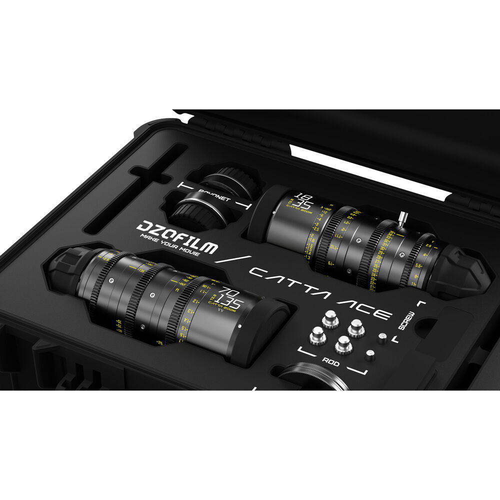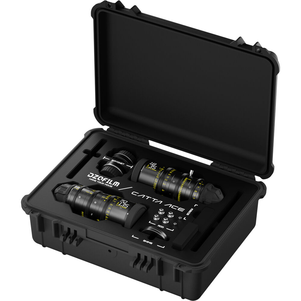 Add two full-frame zoom lenses to your production kit to cover multiple focal lengths and cameras with this Catta Ace FF 18-35/70-135mm T2.9 Cine 2-Lens Bundle from DZOFilm. The kit includes a black Catta Ace PL-mount 18-35mm T2.9 zoom lens, a black Catta Ace PL-mount 70-135mm T2.9 zoom lens, two EF-mount bayonet kits, two front lens caps, two rear caps, two shim sets, two support bases, and two support rods. A hard-shell case with custom-cut foam is also included to store and transport the lenses.