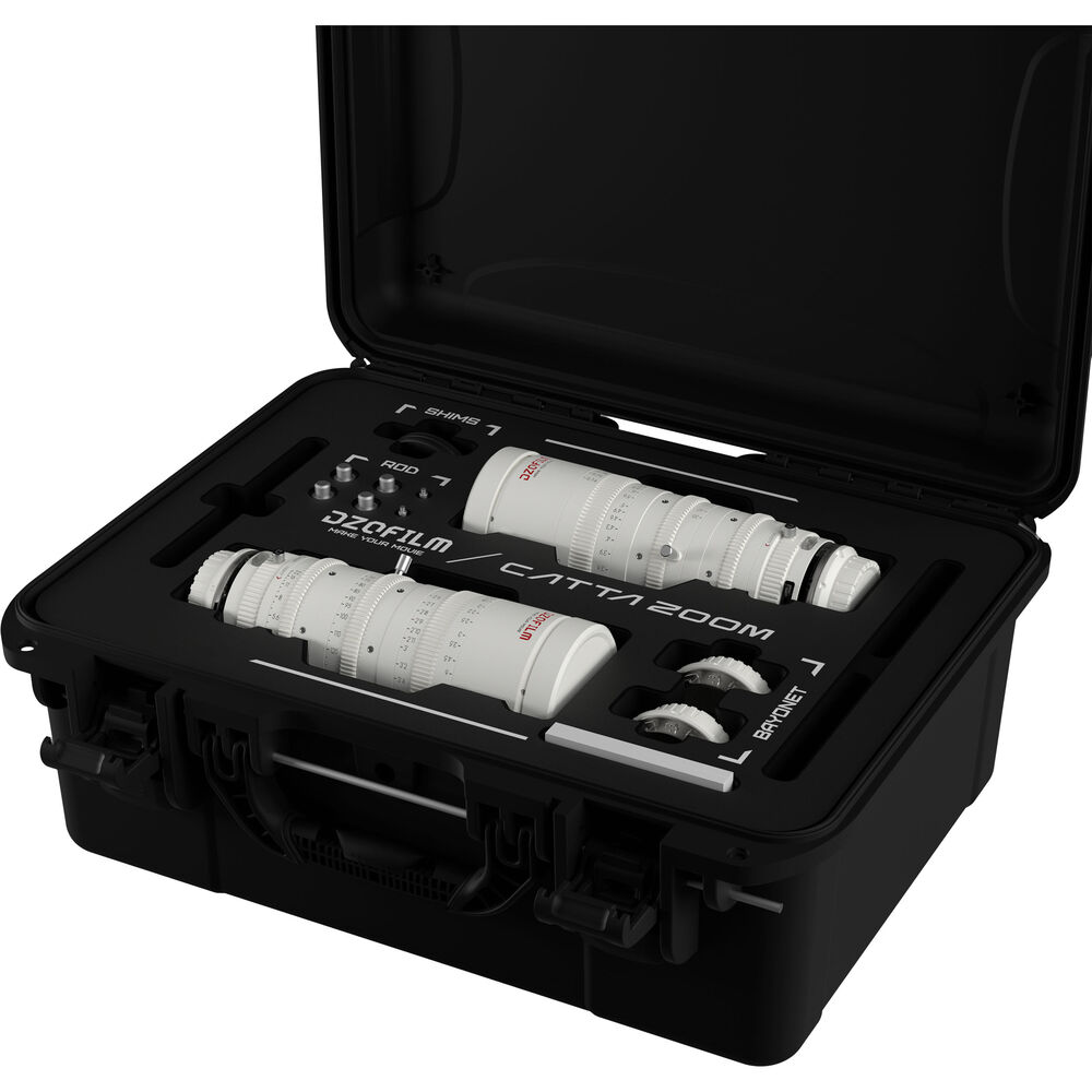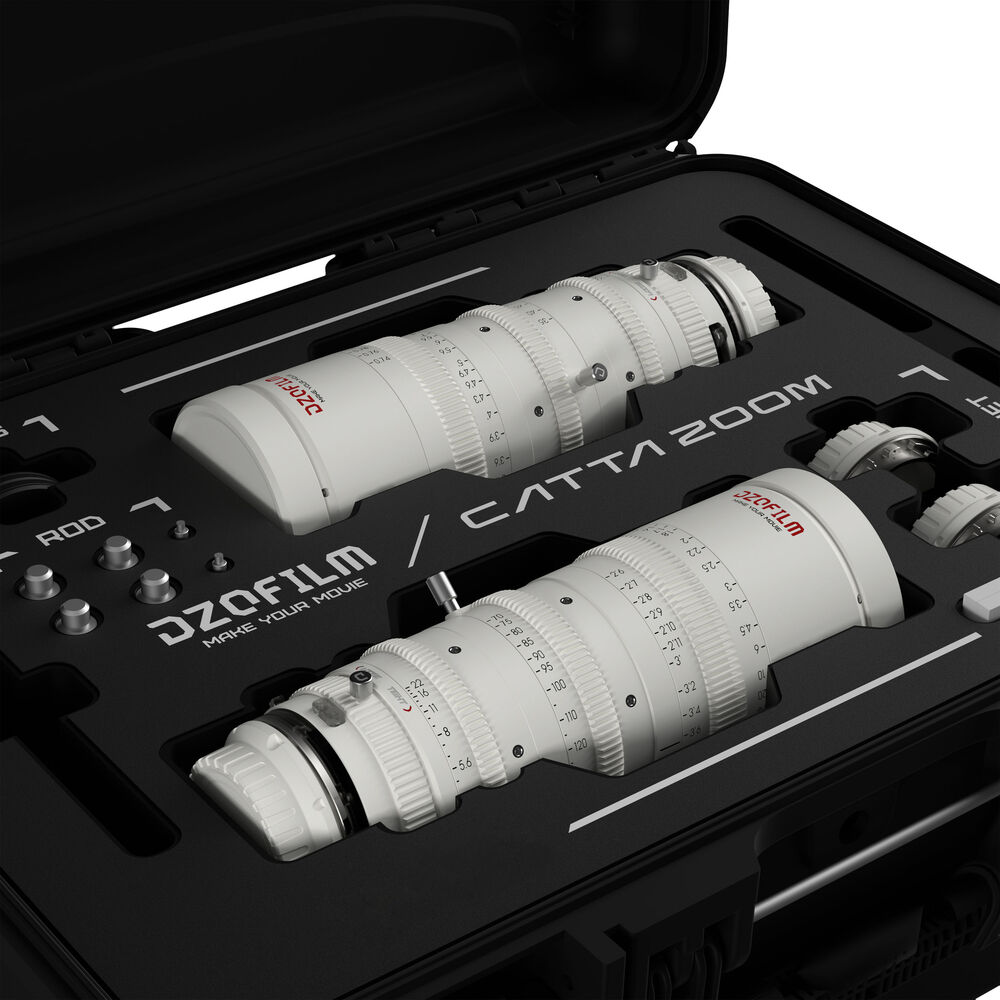 Add two full-frame zoom lenses to your production kit to cover multiple focal lengths and cameras with this white Catta FF 18-35/35-80 T2.9 Cine 2-Lens Bundle from DZOFilm. The kit includes a white Catta Sony E-mount 18-35mm T2.9 zoom lens, a white Catta Sony E-mount 35-80mm T2.9 zoom lens, two front lens caps, two rear caps, two shim sets, two support bases, and two support rods. A hard-shell case with custom-cut foam is also included to store and transport the lenses.