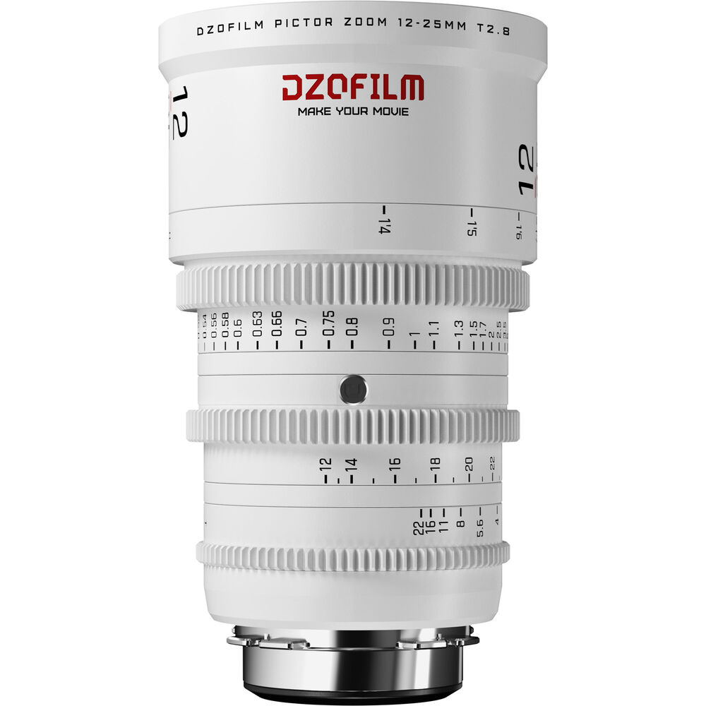 The white, parfocal DZO Pictor 12-25mm T2.8 Super35 Zoom Lens features an aperture range of T2.8 to T22, the ability to hold focus throughout the zoom range, and an internal focus design with floating elements that virtually eliminates focus breathing.