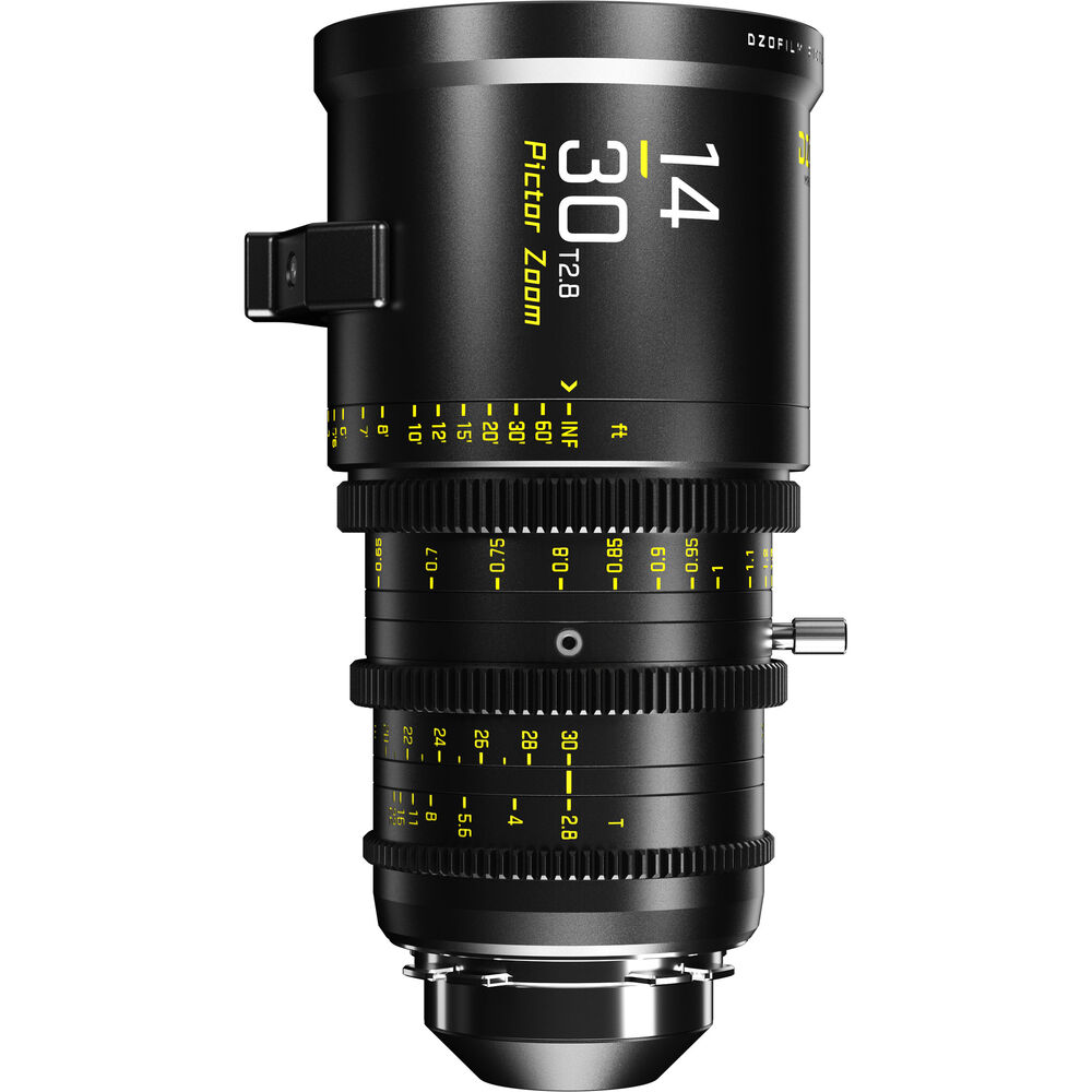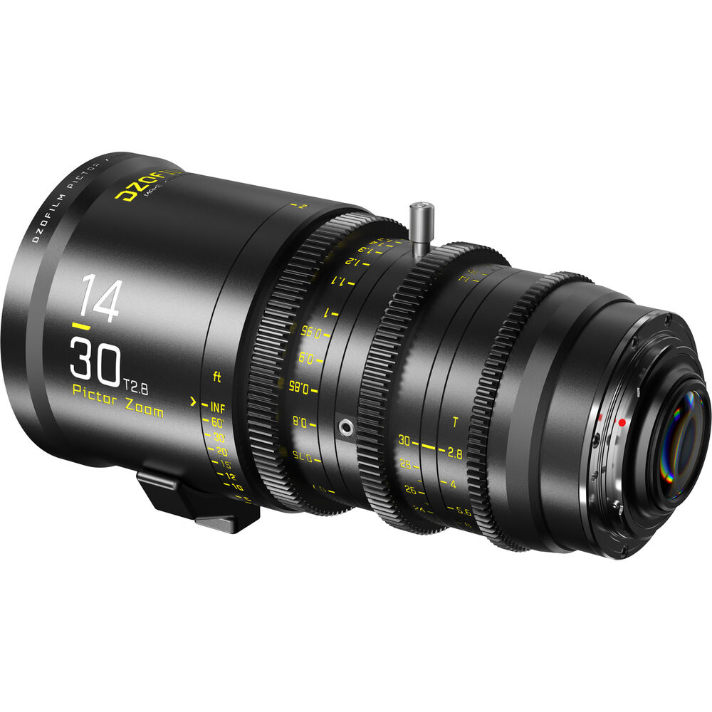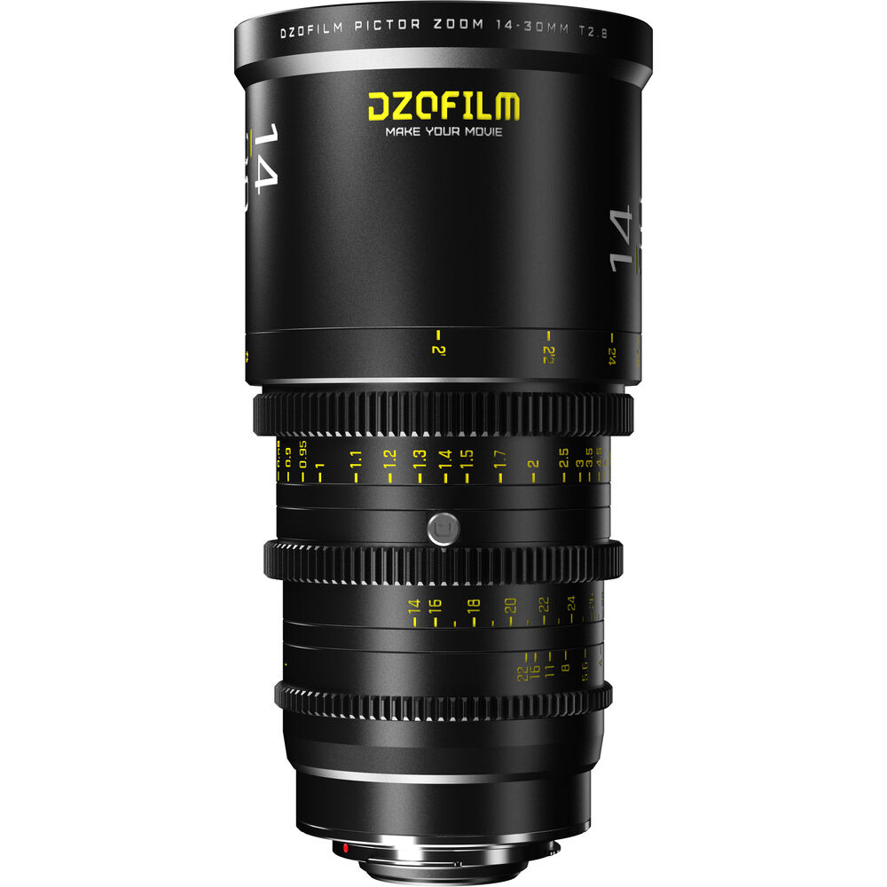 The black Pictor 14-30mm T2.8 Super35 Parfocal Zoom Lens from DZOFilm features a relatively fast maximum aperture of T2.8 with an aperture range of T2.8 to T22, and it adds an extreme wide-angle zoom to the Pictor line of lenses. As you would expect from a cinema-style zoom, the lens is parfocal, meaning it holds focus throughout the zoom range. The internal focus design with floating elements virtually eliminates focus breathing. It covers a Super35 image circle, comes standard with an interchangeable PL mount, and includes an EF mount.