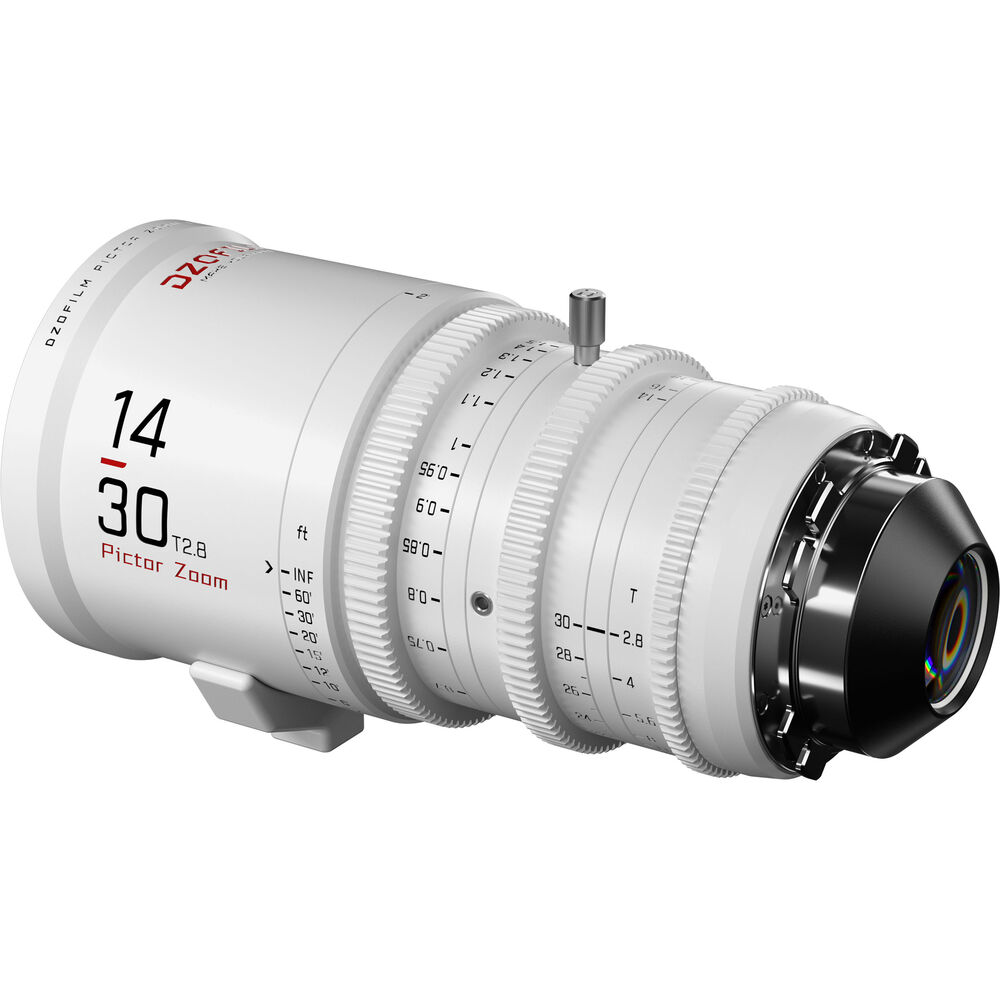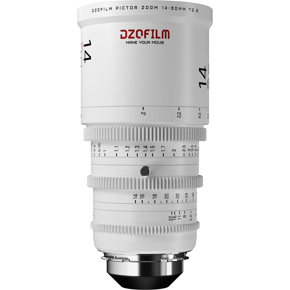 The white Pictor 14-30mm T2.8 Super35 Parfocal Zoom Lens from DZOFilm features a relatively fast maximum aperture of T2.8 with an aperture range of T2.8 to T22, and it adds an extreme wide-angle zoom to the Pictor line of lenses. As you would expect from a cinema-style zoom, the lens is parfocal, meaning it holds focus throughout the zoom range. The internal focus design with floating elements virtually eliminates focus breathing. It covers a Super35 image circle, comes standard with an interchangeable PL mount, and includes an EF mount.
