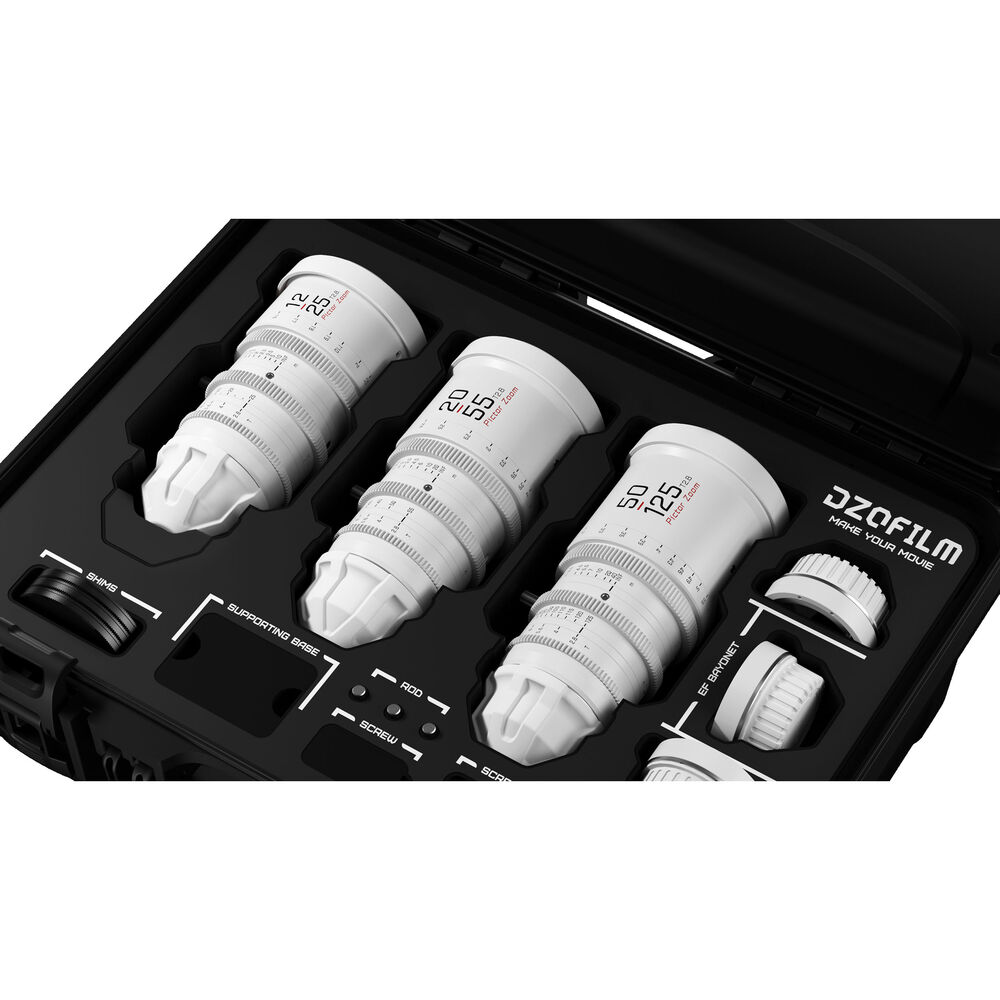 This Pictor T2.8 Super35 Zoom 3-Lens Kit from DZOFilm consists of the 12 to 25mm, 20 to 55mm, and 50 to 125mm zooms in a white finish. Together, these lenses provide a wide extended zoom range with a relatively fast maximum aperture. Each zoom covers Super35 sensors and has a similar length, weight, lens gear positions, and front diameter, enabling fast lens swaps.