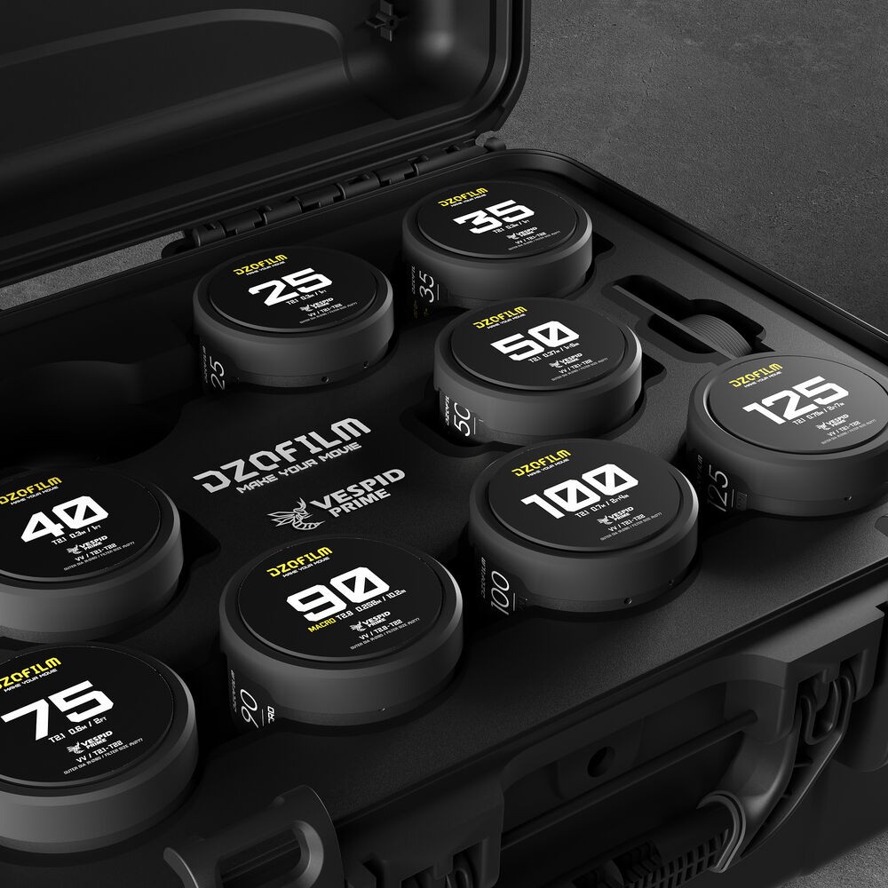 Ideal for rental houses and cinematographer's kits, the DZOFilm VESPID Prime 9-Lens Kit provides a wide range of cine-style lenses suitable for almost any project. Offering full-frame coverage, the kit comprises 16, 25, 35, 40, 50, 75, 90, 100, and 125mm PL mount lenses and EF-mount adapters for each lens. These lenses project a 46.5mm image circle yet are compact and lightweight, making them suitable for handheld, gimbal, and drone use.