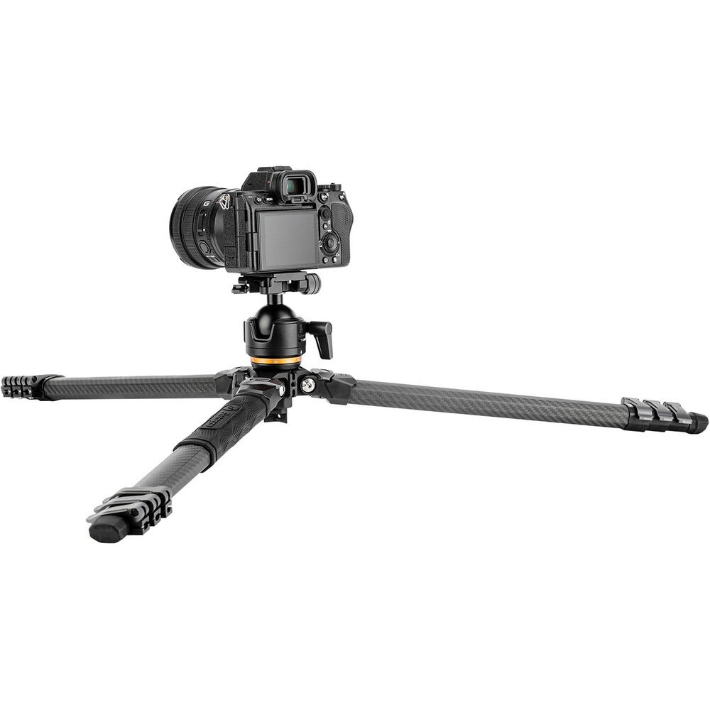 The Origin Plus Travel Tripod features a lightweight, 3.4 lb carbon fiber build, a maximum load capacity of 44.1 lb, an adaptable working height range of 6.7 to 60.4", and a portable folded length of 19.8". The dual-head pan/tilt system mounts to the removable center column for extendable height, or it can be mounted directly to the tripod base for low-angle shots. The panoramic head provides flat, consistent panning, while the pan/tilt ball head maximizes freedom of movement. The included mounting plate is Arca-Swiss compatible for quick and easy camera attachment.
