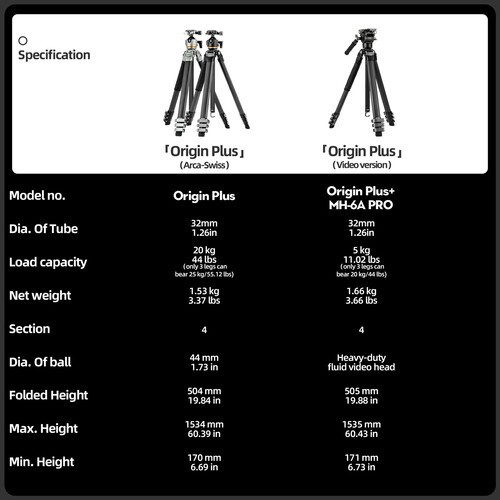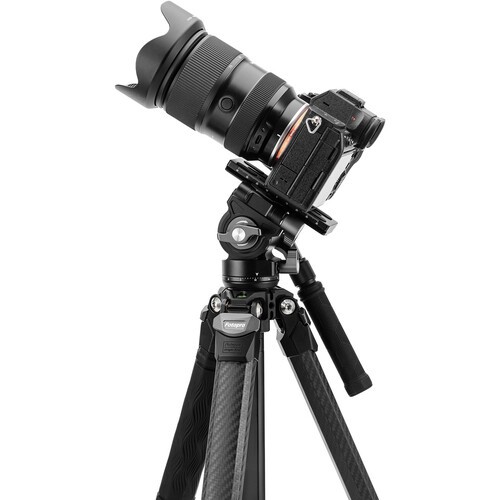 Equipped with Fotopro's MH-6A Pro Fluid Video Head, the Origin Plus features a lightweight, 3.7 lb carbon fiber build, an adaptable working height range of 6.7 to 60.4", a portable folded length of 19.8", and a load capacity of 11 lb. The hydraulic video head mounts to the removable center column for extendable height, or directly to the tripod base for low-angle shots. With its tilt range of -90 to 60°, 360° panning ability, independent pan and tilt locks, adjustable handle, and integrated bubble levels, the MH-6A Pro ensures smooth, dynamic movement in a compact form factor. The included quick release plate is Arca-Swiss compatible and has a 1/4"-20 screw for quick and easy camera mounting.