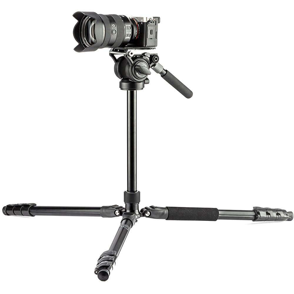 The center column allows you to open the tripod legs so your tripod head can become lower to the ground. The removable head also features a bubble level, half-ball leveling adjustment, a 3/8"-16 mounting screw for different heads, a dovetail-style plate, and a pan bar with a padded grip.