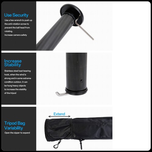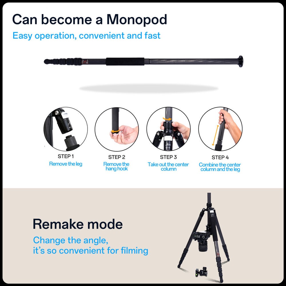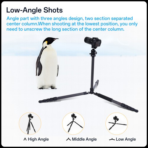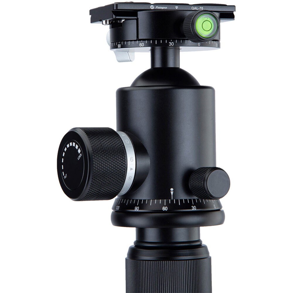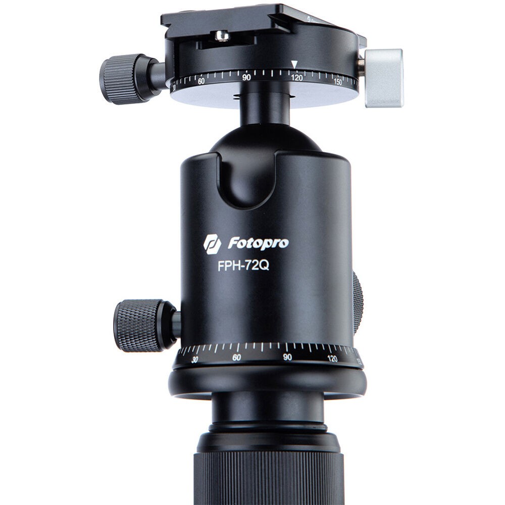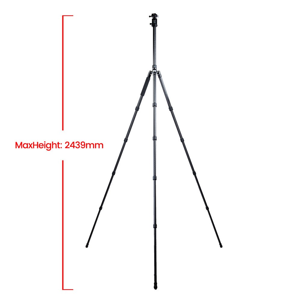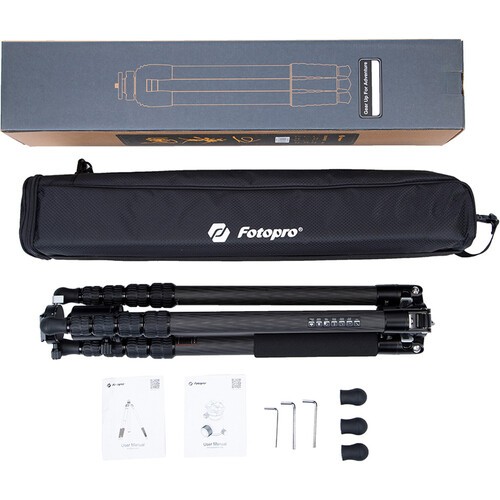 Capture stable images at a wide range of heights with the X-75C Carbon Fiber Tripod from Fotopro. The X-75C features a lightweight, 5.9 lb carbon fiber build, a maximum load capacity of 26.5 lb, a working height range of 9 to 96", and a portable folded length of 23.2". In combination with the included Fotopro FPH-72Q ball head, the X-75C tripod maximizes freedom of movement, allowing versatile panning and tilting. The tripod's five-section legs feature twist locks for easy height adjustments, spiked metal feet for rough terrain, and rubber foot pads for interior shooting.