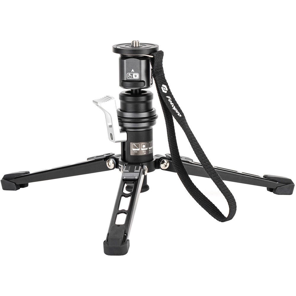 The bottom of the monopod can be swapped between a rubber foot for flat surfaces, a metal spike for rougher terrain, and a set of quick release tripod legs for maximal stability. A built-in pedal locks and unlocks the tripod's tilting mechanism, allowing for fast adjustments to the monopod's angle. For camera attachment, the X-Airfly includes a universal mounting interface with 1/4"-20 and 3/8"-16 mounting options. The mounting interface can be attached directly to the tripod base for low-angle shooting.