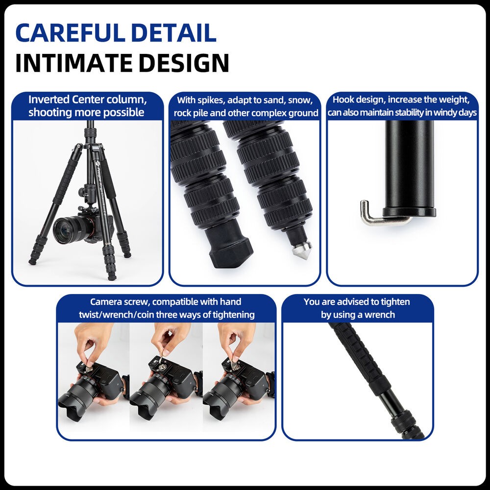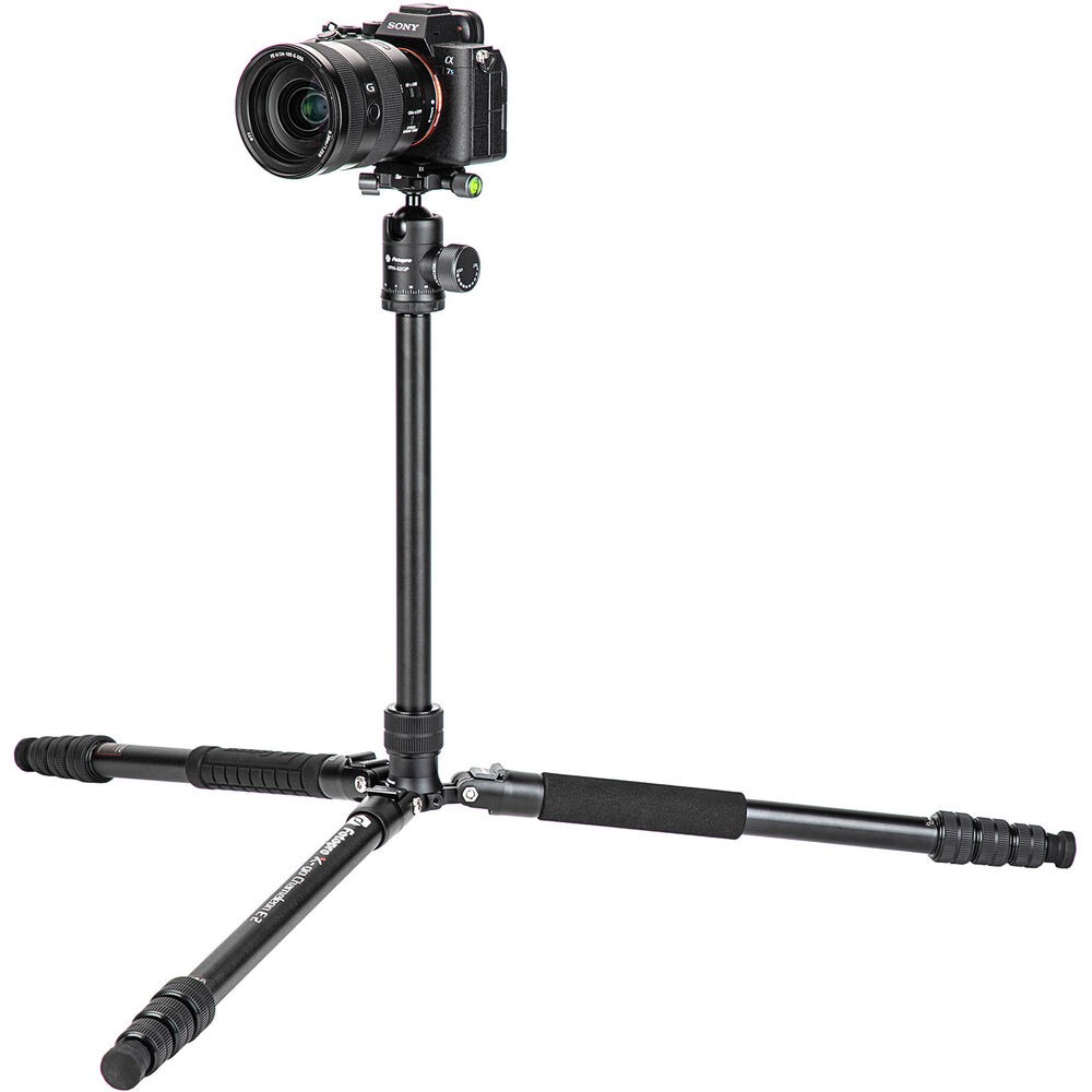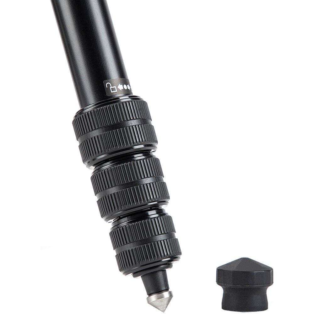 Twist locks on the four-section legs and two-section center column make height adjustments intuitive and convenient. The center column can be inverted for low-angle shooting, and one leg can detach and function as a monopod. Spiked metal feet provide stable grip for rugged terrain and adverse weather conditions, while the included rubber foot pads allow interior shooting without leaving a mark. Camera attachment is fast and easy with the Arca-type quick release mounting plate.