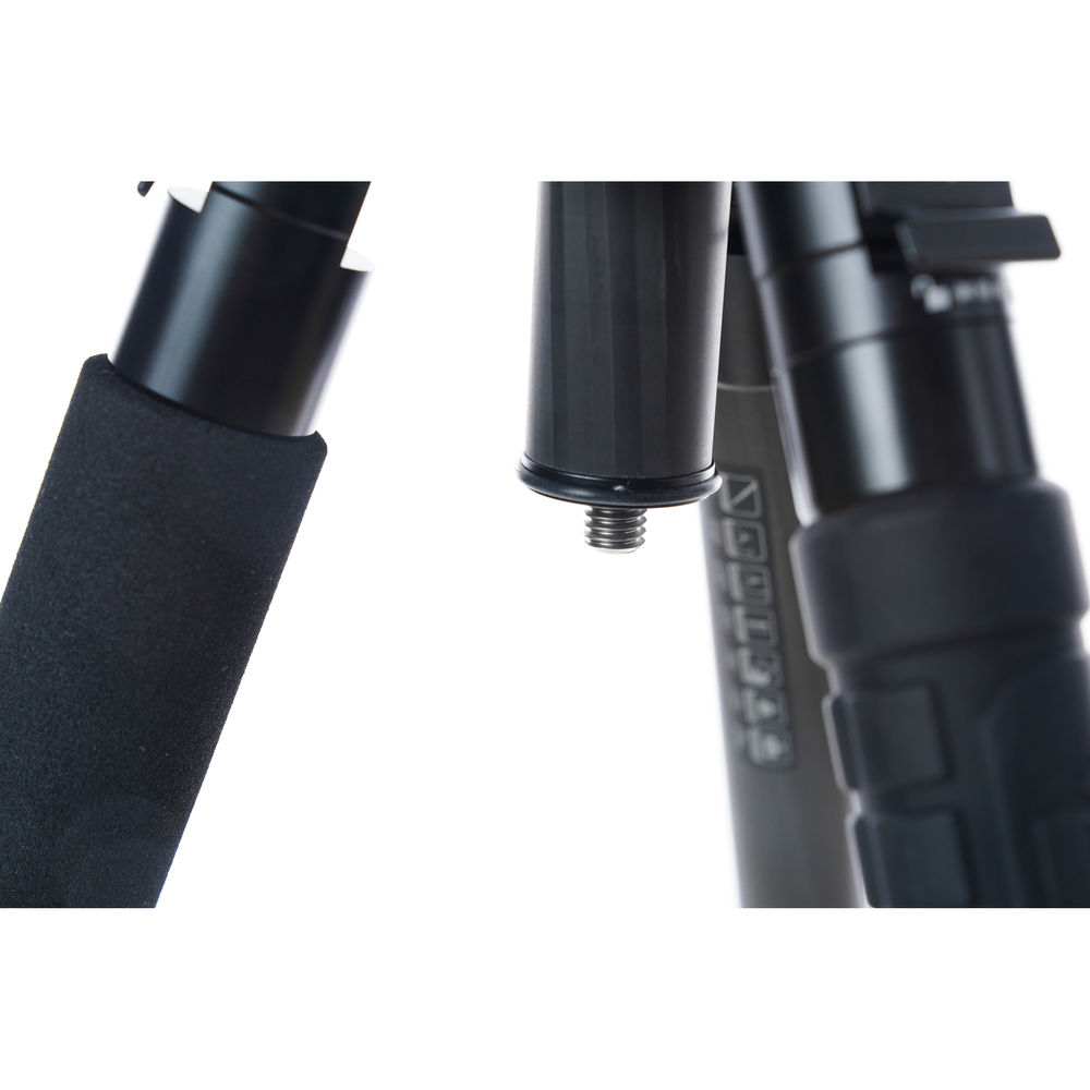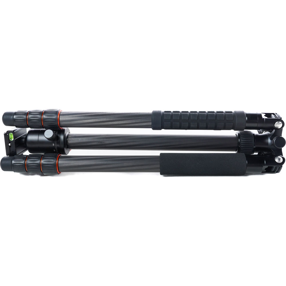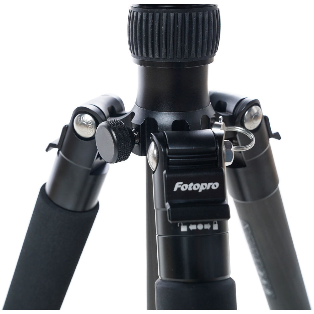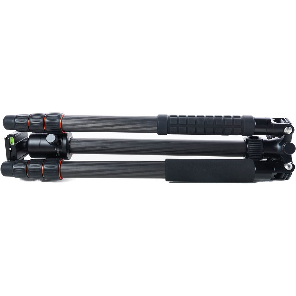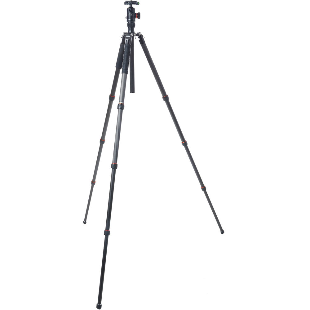 The black X-GO Max Carbon Fiber Tripod Kit with FPH-62Q Ball Head from Fotopro is a 4-section carbon fiber support that has a twist lock leg system that allows, along with the rapid center column, for a maximum height of 67.6". Splaying the legs completely out enables the tripod to go as low as 18.4", and the variable leg angles allow the tripod to conform to uneven terrain. The tripod's ball head has two separate knobs, one that controls the movement of the ball, which can be positioned at a 90° angle, and a second knob controls the 360° pan. A bubble level is included to help you maintain a level horizon, and one of the legs is removable, enabling it to convert into a monopod. This allows you to have a camera support when a tripod cannot enter certain areas. Additionally, the legs fold in the reverse making it compact for storage and transport.