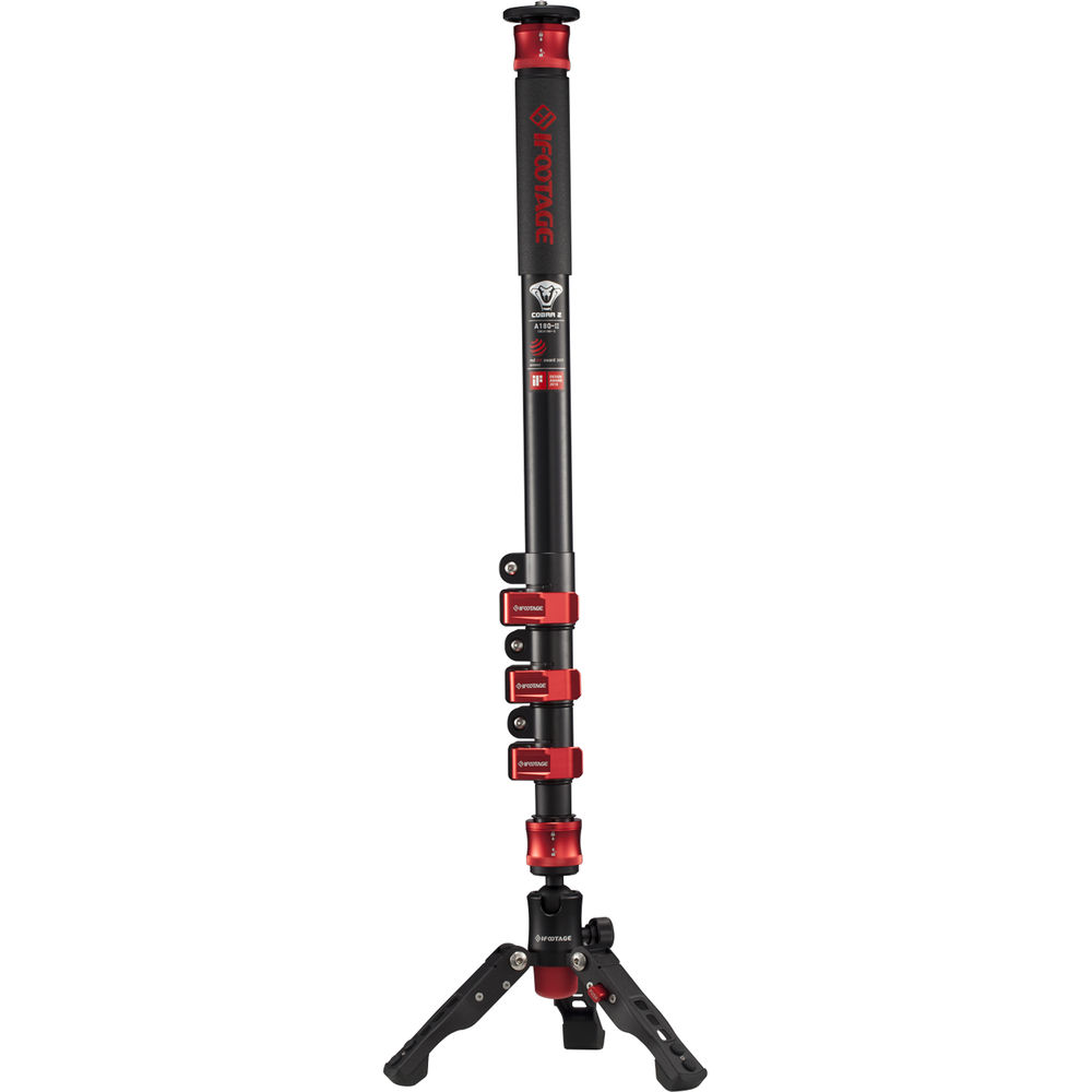 The versatile 3.1 lb Cobra 2 A180-II Aluminum Monopod with Low-Profile Tripod from iFootage stabilizes your camera to produce still images, or it swivels smoothly to capture video. By disengaging its flip leg locks, you can extend the 4-section monopod, which has a load capacity of 17.6 lb, from a folded length of 27.8" to a maximum height of 70.9". At the bottom, the base folds out to three feet with a swiveling base that has tension control with a lock, and it allows you to follow a subject easily while capturing video. With the feet folded up, a rubber foot is exposed, so the monopod can be used in a conventional way without the swiveling base. The base is also removable, and it converts into a mini tripod that can be used for macro or tabletop photography.