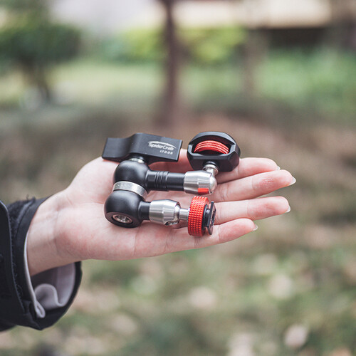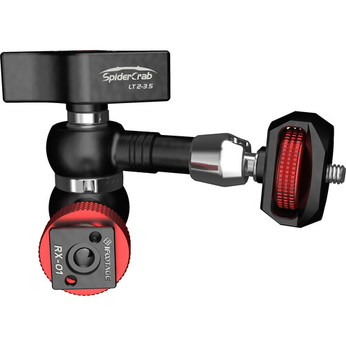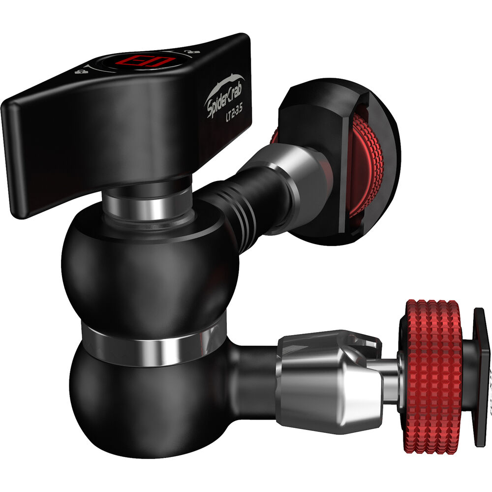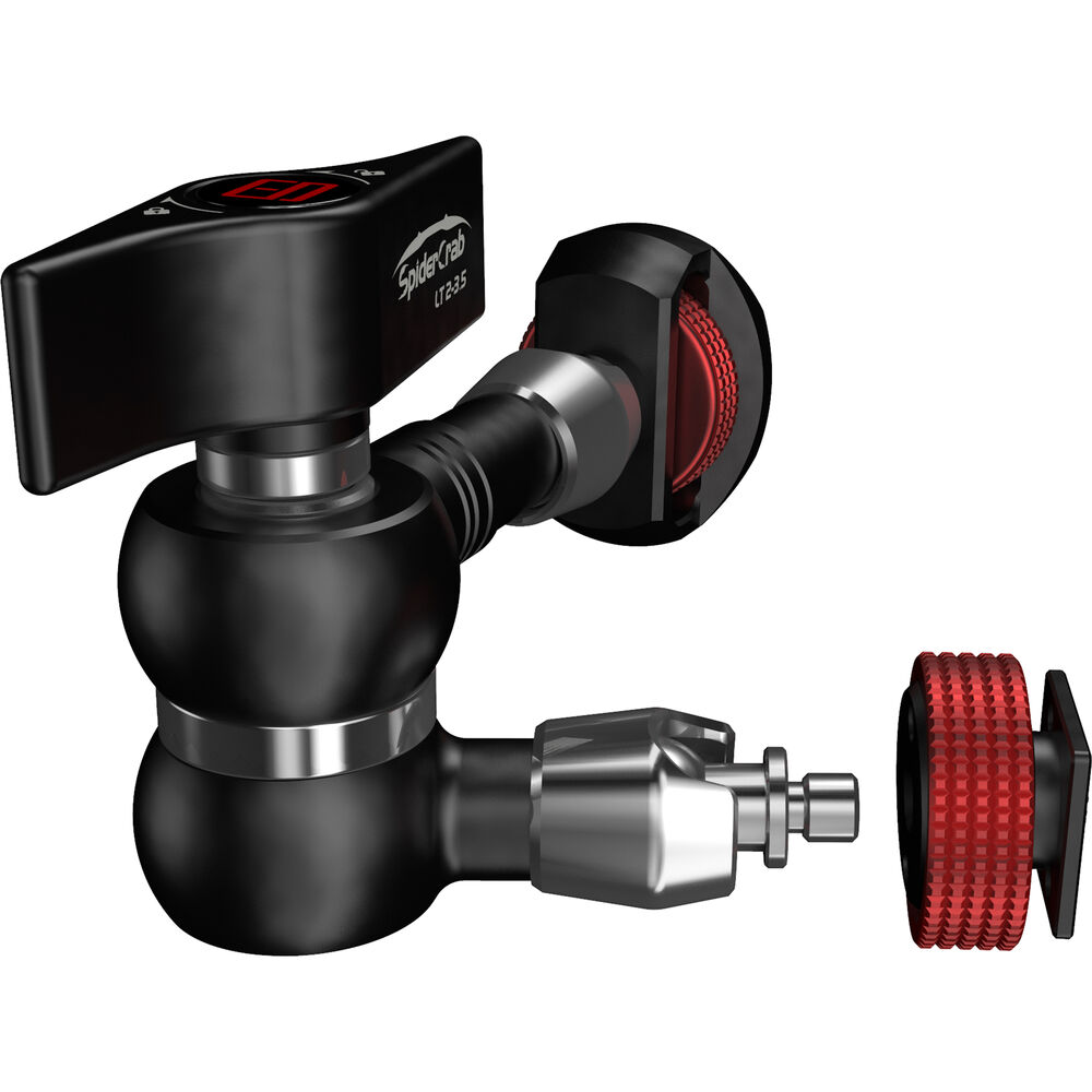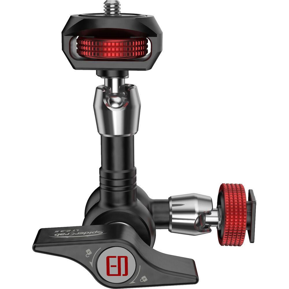 The 1/4"-20 mounting end features an oversized thumbwheel with an embossed pattern for better grip. Both ends of the arm move freely and independently until you lock the arm. Anti-slip gears in the center hub hold the arm in the position you set when tightening the central locking lever, which also locks the ends in position.