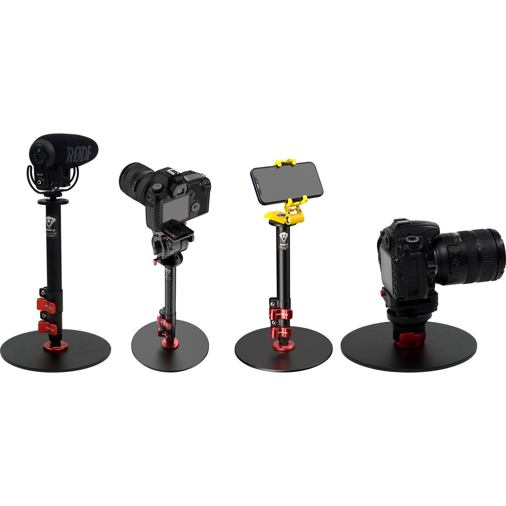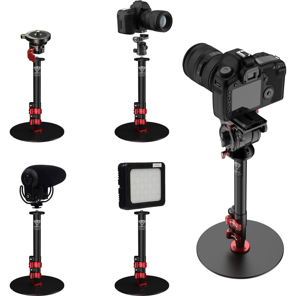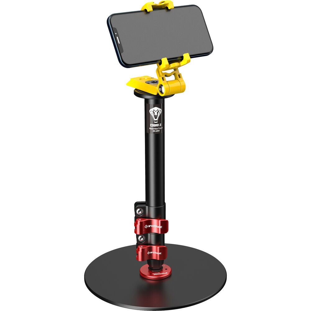 The RB-A200 Cobra 2 Round-Base Monopod from iFootage is a round-based monopod designed for desktop, office, studio, or for anywhere else where there is a suitable flat, solid surface. It offers a simple and neat solution for supporting cameras, microphones, lights, and monitors in place of cumbersome conventional stands and tripods. The RB-A200 is 22" tall, aluminum desktop solution for presenters, vloggers, influencers, streamers, and anyone else providing social media creative content. It has a maximum height of 22", and the round base plate has a fabric non slip, non scratch under carriage that will reliably and solidly support up to 22 pounds. The aluminum center support features flip-lock joins for rapid setup and adjustment.