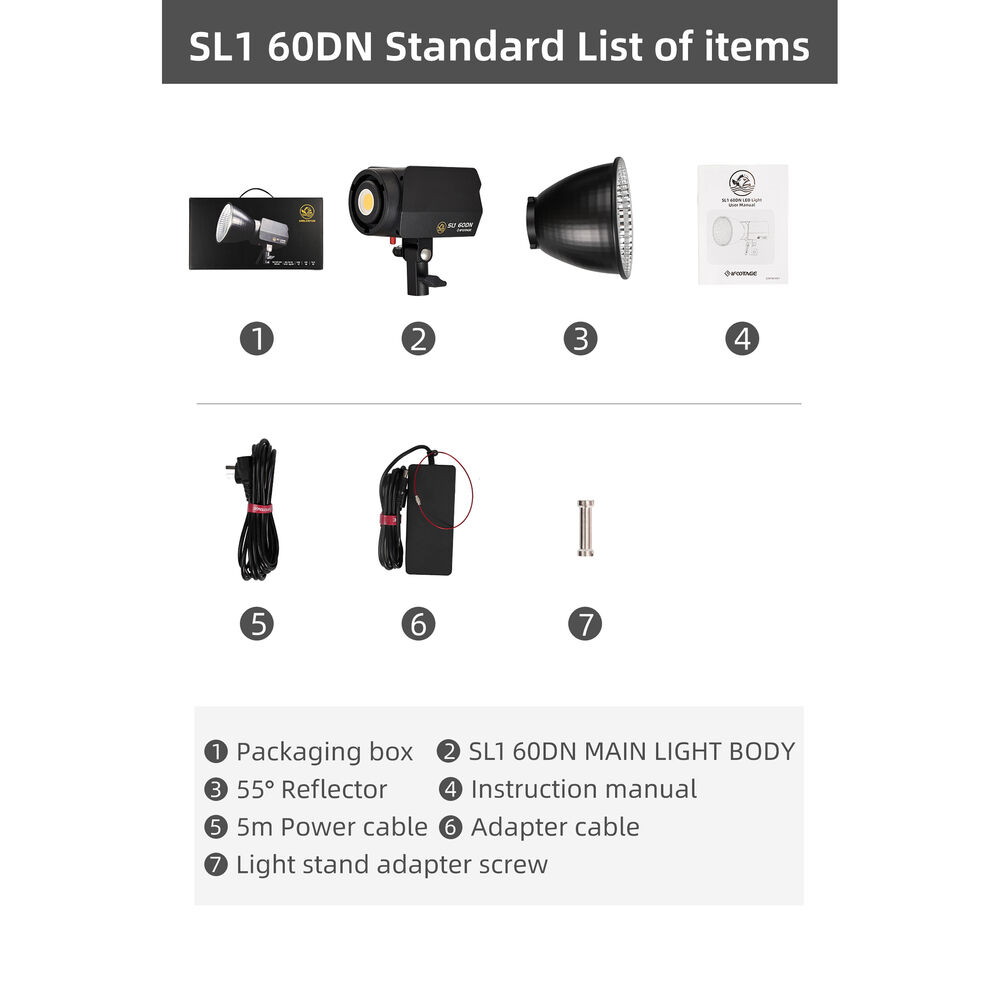 The SL1 60DN comes with an OLED display and enables an effortless and intuitive on-board or Lumin App control via Bluetooth. The light is powered via its 100 to 240V power adapter but will also run on a V-mount battery via a separately available V-mount handheld grip when AC power is unavailable, making it suitable for indoor and outdoor use. It allows multiple power options including mains supply, V-mount battery, USB type-C power supply, and a 970 battery pack. It also accepts a separately available Bowens mount adapter for use with compatible diffusers, beauty dishes, and other accessories.