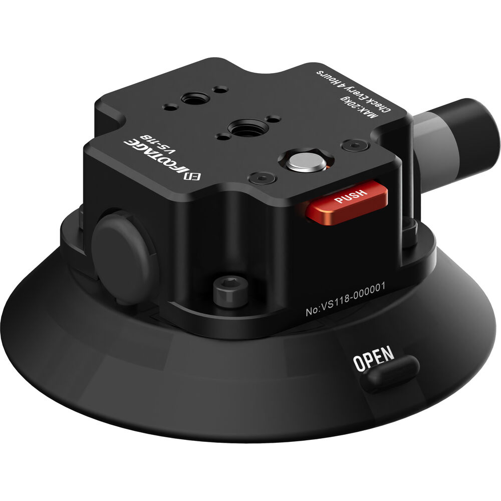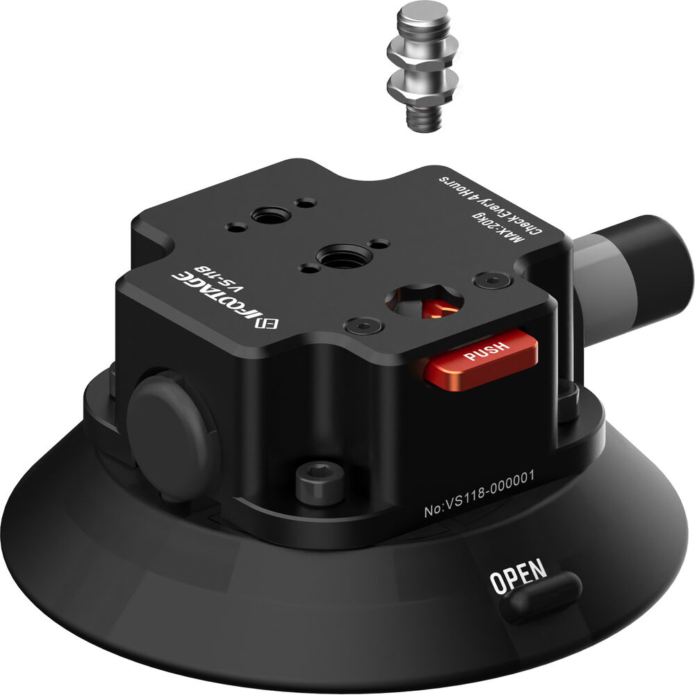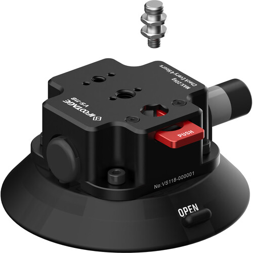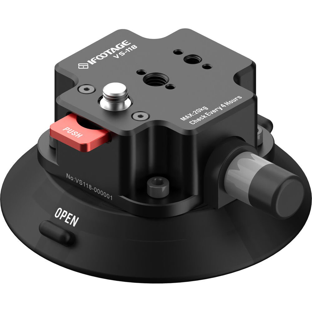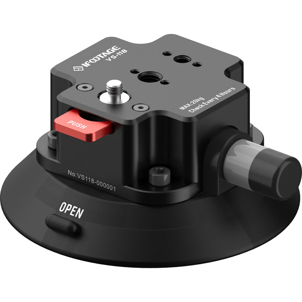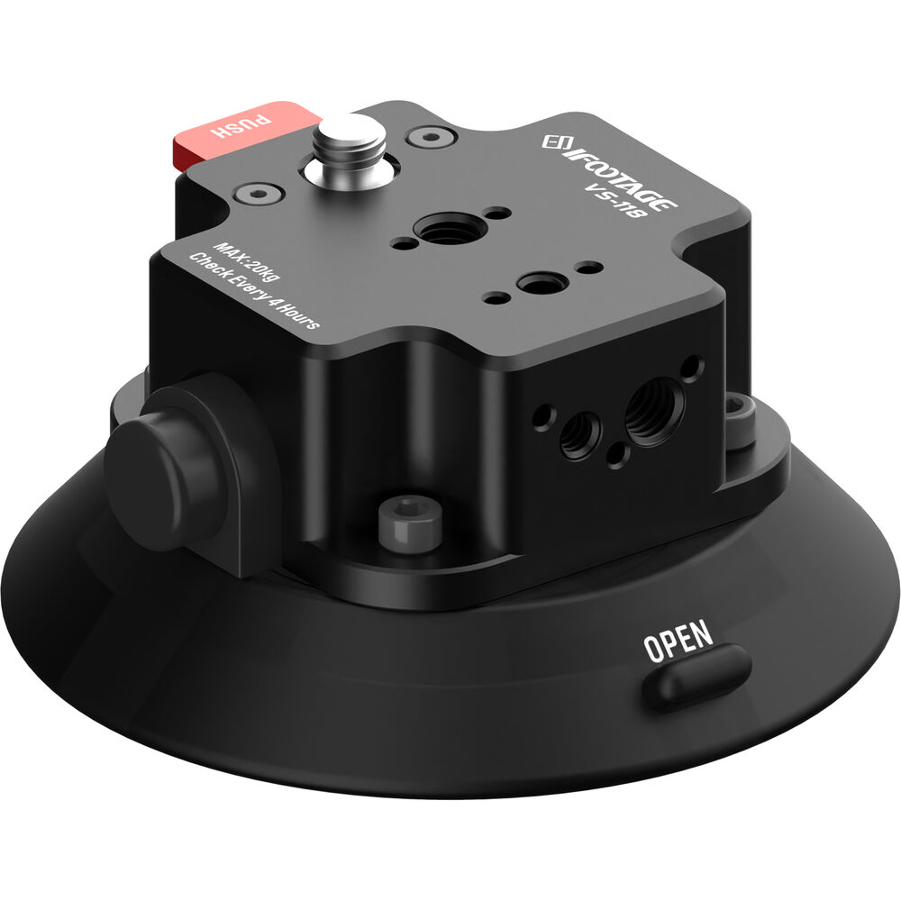 The VS-118 Spider Crab Vehicle Suction Cup from iFootage is an industrial-grade aluminum and rubber suction mount used in creating camera vehicle rigs with the iFootage Spider Crab vehicle mount system. A large pump button on the side creates a vacuum for a solid grip. It features a reversible 1/4"-20 and 3/8"-16 mounting screw, as well as multiple mounting threads to add mounting gear, accessories, and camera heads. This model of the cup supports payloads up to 44 lb.