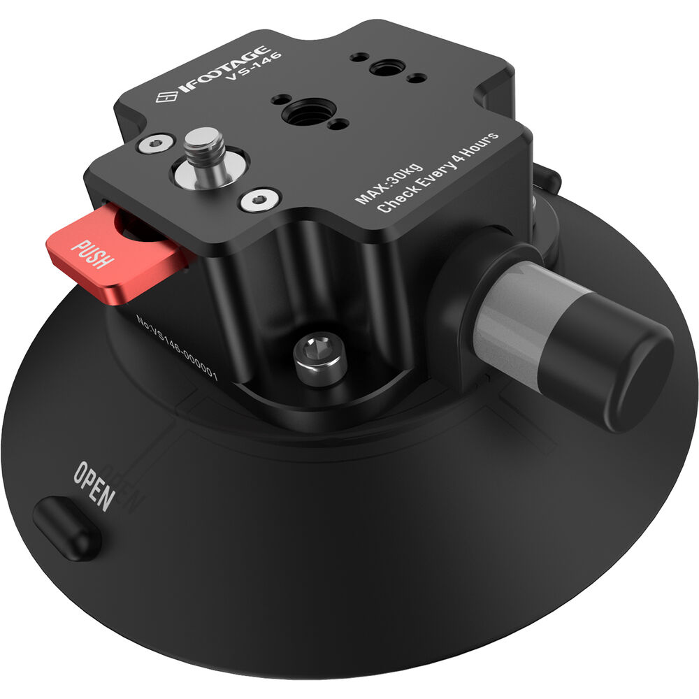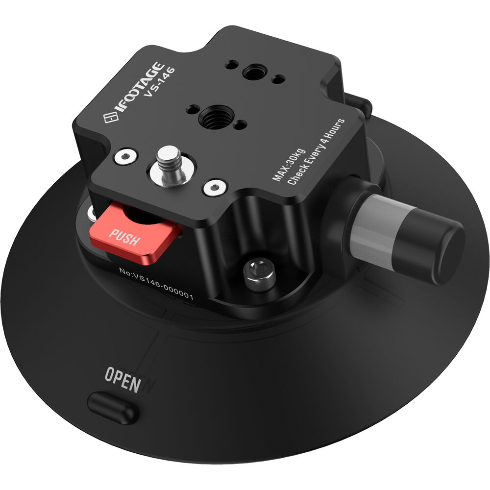he VS-146 Spider Crab Vehicle Suction Cup from iFootage is an industrial-grade aluminum and rubber suction mount used in creating camera vehicle rigs with the iFootage Spider Crab vehicle mount system. A large pump button on the side creates a vacuum for a solid grip. It features a reversible 1/4"-20 and 3/8"-16 mounting screw, as well as multiple mounting threads to add mounting gear, accessories, and camera heads. This model of the cup supports payloads up to 66 lb.